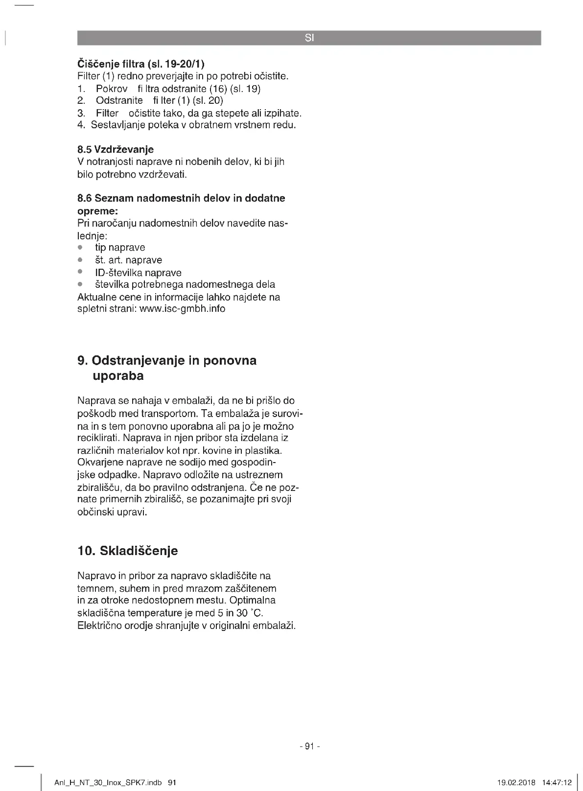 Samo za dežele EU Električnega orodja ne mečite med gospodinjske odpadke! V skladu z evropsko smernico 2012/19/EG o starih električnih in elektronskih napravah in v skladu z iz- vajanjem nacionalne zakonodaje morate ločeno zbirati izrabljena električna orodja in jih predati v okoljs- ko varno ponovno predelavo. Reciklažna alternativa za poziv za vračanje: Lastnik električne naprave je alternativno zavezan, da namesto vračanja sodeluje pri pri strokovno ustreznem recikliranju v primeru predaje lastnine. Staro napravo se lahko v ta namen tudi prepusti na odvzemnem mestu, ki izvaja odstranjevanje v smislu nacionalne zakonodaje o odstranjevanju takšnih odpadkov. To se ne nanaša na starim napravam priložene dele pribora in opreme brez električnih kom- ponent. Ponatis ali kakršnokoli razmnoževanje dokumentacije in spremljajočih papirjev o proizvodu, tudi po izvlečkih, je dovoljeno samo z izrecnim soglasjem ISC GmbH. Pridržana pravica do tehničnih sprememb Anl_H_NT_30_Inox_SPK7.indb 92Anl_H_NT_30_Inox_SPK7.indb 92 19.02.2018 14:47:1219.02.2018 14:47:12SI