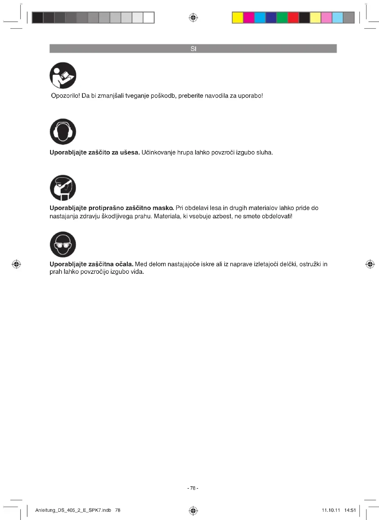 Opozorilo! Da bi zmanjšali tveganje poškodb, preberite navodila za uporabo! Uporabljajte zaščito za ušesa. Učinkovanje hrupa lahko povzroči izgubo sluha. Uporabljajte zaščitna očala. Med delom nastajajoče iskre ali iz naprave izletajoči delčki, ostružki in prah lahko povzročijo izgubo vida. Uporabljajte protiprašno zaščitno masko. Pri obdelavi lesa in drugih materialov lahko pride do nastajanja zdravju škodljivega prahu. Materiala, ki vsebuje azbest, ne smete obdelovati! Anleitung_DS_405_2_E_SPK7.indb 78Anleitung_DS_405_2_E_SPK7.indb 78 11.10.11 14:5111.10.11 14:51SI