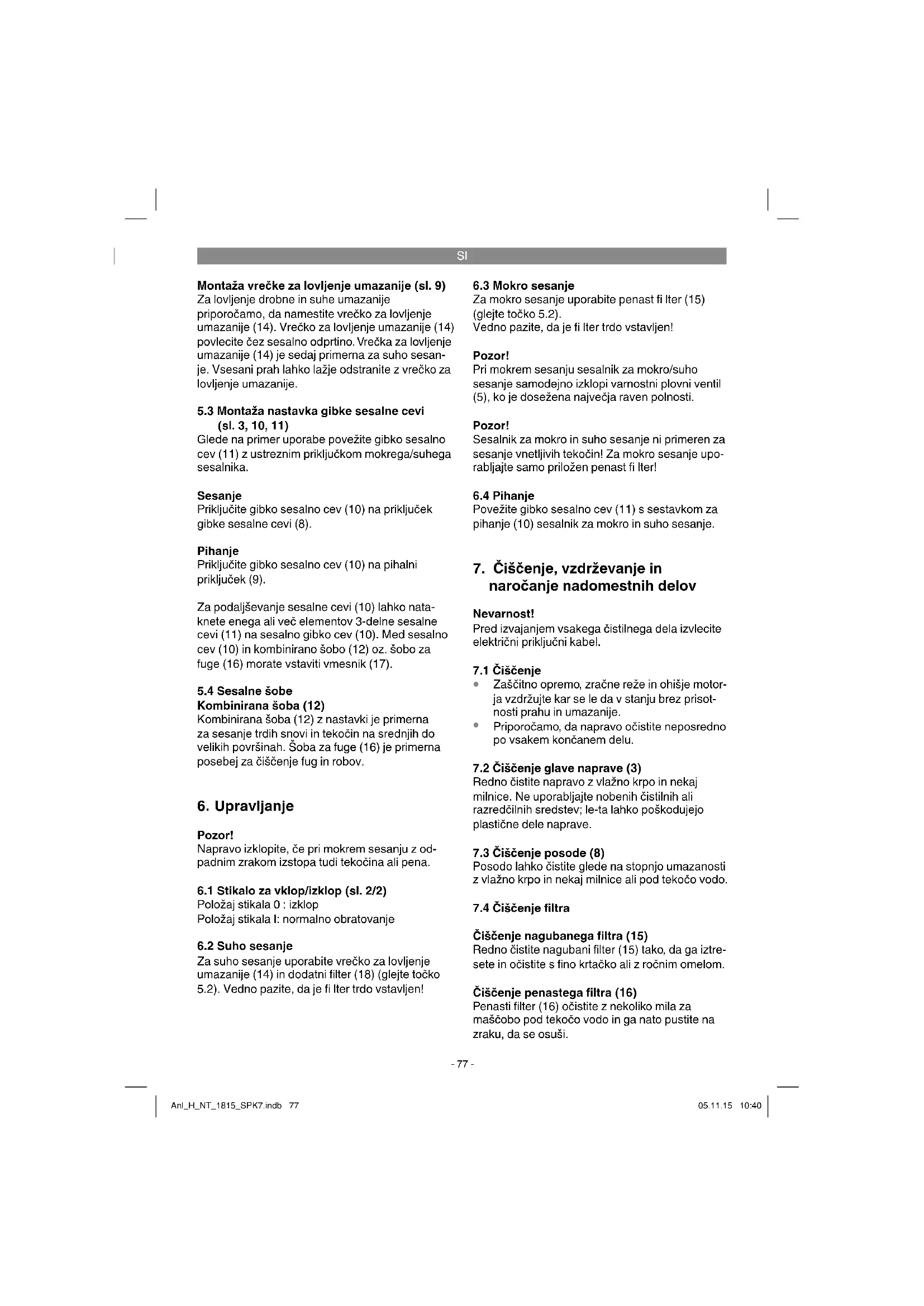 Pozor! Napravo izklopite, če pri mokrem sesanju z od- padnim zrakom izstopa tudi tekočina ali pena.