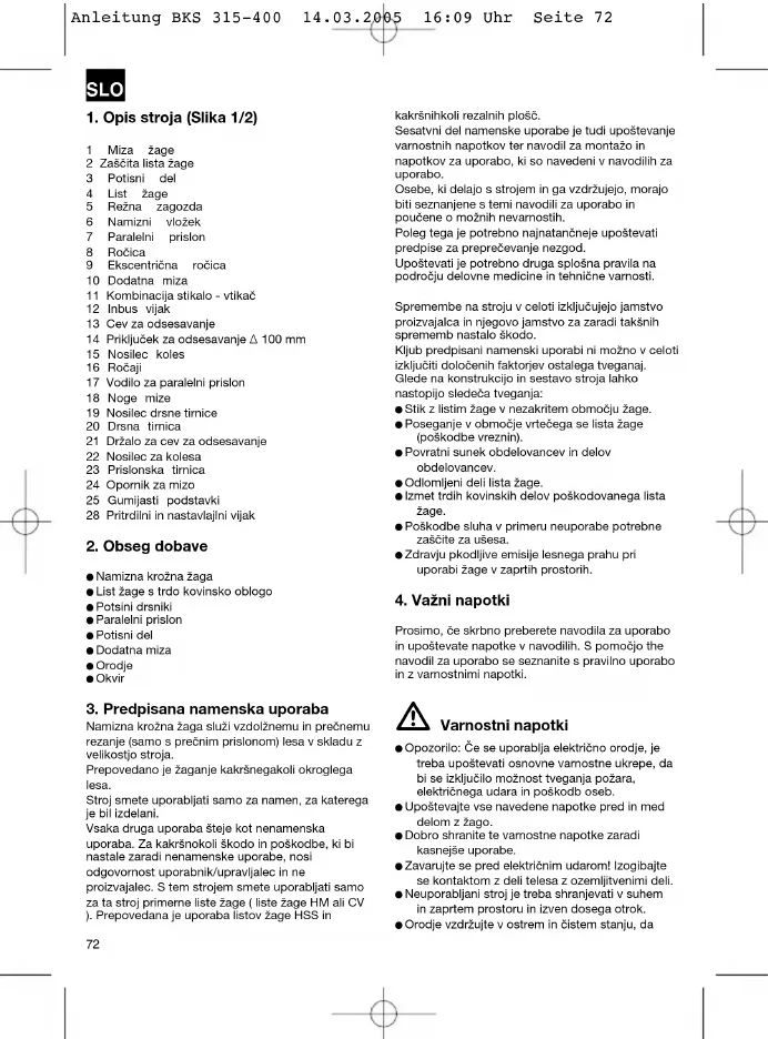 Anleitung BKS 315-400 14.03.2005 16:09 Uhr Seite 72boste lahko delali boljše in varneje. Redno kontrolirajte električni kabel orodja in v primeru poškodbe kabla, naj le-tega popravi priznani strokovno usposobljeni strokovnjak. Redno kontrolirajte kabelski podaljšek in ga zamenjajte, če je poškodovani. Na prostem uporabljajte samo za ta namen dovoljene in odgovarjajoče označene kabelske podaljške. Pazite na to, kaj počnete. Dela se lotite zmeraj s premislekom. Orodja ne uporabljajte, če ste utrujemi. Ne uporabljajte orodij, pri katerih ni možno vklapljati in izklapljati stikal. Opozorilo! Uporaba drugega nadomestnega orodja in drugega pribora lahko za Vas predstavlja nevarnost. Pri izvajanju kakršnihkoli vzdrževalnih ali nastavitvenih del zmeraj potegnite električni vtikač iz električne omrežne vtičnice. Te varnostne napotke posredujte naprej vsem osebam, ki delajo s strojem. Te žage ne uporabljajte za žaganje lesa za kurjavo. Ne izvajajte prečnega rezanja okroglih kosov lesa. Prevodno! Zaradi rotirajočega žagalnega lista obstaja nevarnost poškodb za Vaše prste in roke. Ta stroj je opremljeni z varnostnim stikalom (11) pred ponovnim vklopom v primeru izpada električne napetosti. Pred zagonom oz. uporabo stroja preverite, če se na tipski podatkovni tablici navedena električna napetost sklada z omrežno napetostjo. Če potrebujete kabelski podaljšek, se najprej prepričajte, če presek kabelskega podaljška zadostuje za prevzem moči električnega toka za žago. Najmanjši zahtevani presek kabla mora znašati 1,5 mm