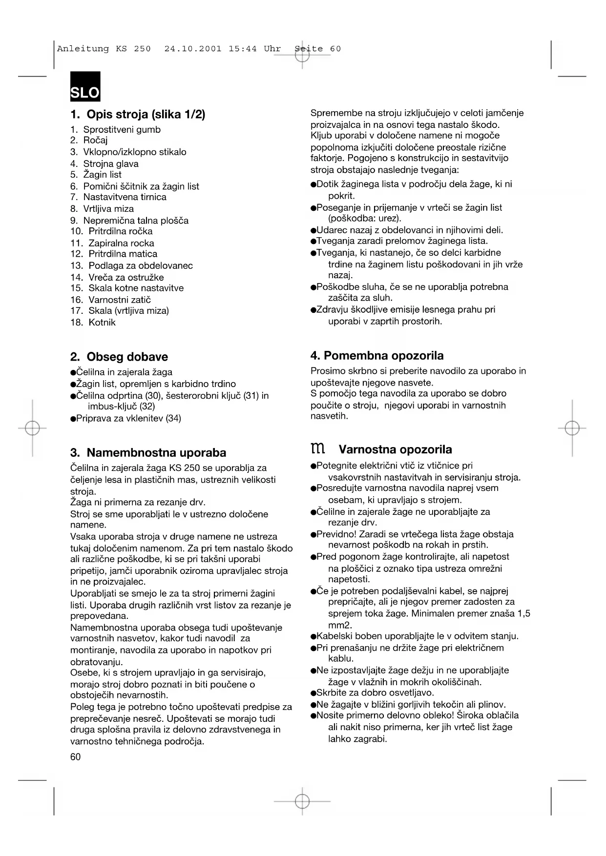 SLO Anleitung KS 250 24.10.2001 15:44 Uhr Seite 61 Skrbite sa sigurno stojo in držite vedno ravnotežje. Preiščite orodje glede eventuelnih napak in škode. Pred nadaljno uporabo orodja morate skrbno preizkati varnostne naprave ali malo poškodovane dele glede njihovega neoporečnega in točno določenega delovanja. Preizkusite, če gibljivi deli nemoteno funkcijonirajo in se ne zatikajo ali če niso poškodovani. Vsi deli morajo biti pravilno montirani in izpolnjevati vse pogoje za nemoteno in sigurno delovanje orodja. Poškodovane zaščitne naprave in dele mora ustrezno popraviti ali izmenjati strokovnjak ene priznane strokovne delavnice ali izjemoma druga oseba, če je to dovoljeno v navodilu za uporabo. Poškodovana stikala naj Vam zamenja servisna služba. To orodje ustreza zadevnim varnostnim določilom. Opravljanje popravil je dovoljeno le elektrostrokovnjaku, pri čemer se smejo uporabljati le originalni rezervni deli. V drugih primerih obstaja za uporabnika nevarnost nesreč. Pri pravokotnih delih bodite previdni! Pozor, pri dvojnih zajeralnih rezih ravnajte posebej previdno! Ne preobremenjujte Vašega orodja! Nosite zaščitna očala! Uporabljajte pri delih, pri katerih nastane veliko prahu, zašcitno masko za dihala. Preiščite kable orodja in podaljševalne kable glede na poškodbe.
