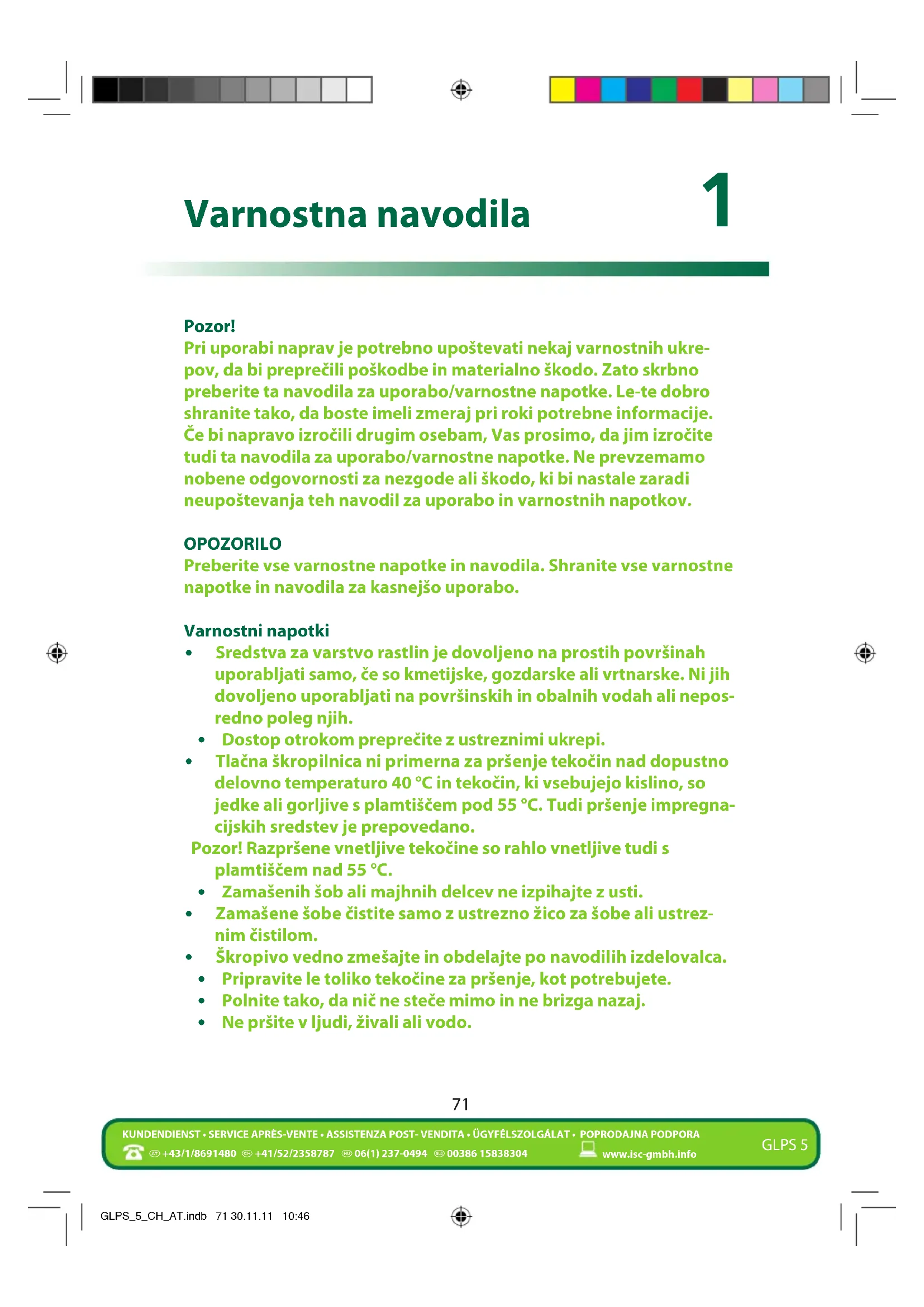 +43/1/8691480 +41/52/2358787 06(1) 237-0494 00386 15838304KUNDENDIENST • SERVICE APRÈS-VENTE • ASSISTENZA POST- VENDITA • ÜGYFÉLSZOLGÁLAT • POPRODAJNA PODPORAwww.isc-gmbh.info GLPS 5 Pozor! Pri uporabi naprav je potrebno upoštevati nekaj varnostnih ukre- pov, da bi preprečili poškodbe in materialno škodo. Zato skrbno preberite ta navodila za uporabo/varnostne napotke. Le-te dobro shranite tako, da boste imeli zmeraj pri roki potrebne informacije. Če bi napravo izročili drugim osebam, Vas prosimo, da jim izročite tudi ta navodila za uporabo/varnostne napotke. Ne prevzemamo nobene odgovornosti za nezgode ali škodo, ki bi nastale zaradi neupoštevanja teh navodil za uporabo in varnostnih napotkov. OPOZORILO Preberite vse varnostne napotke in navodila. Shranite vse varnostne napotke in navodila za kasnejšo uporabo. Varnostni napotki