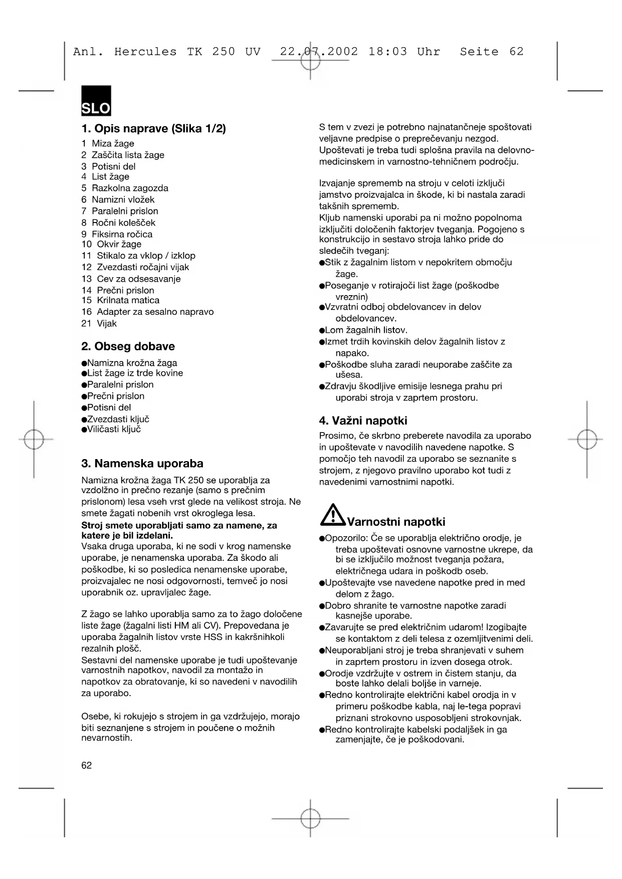 Anl. Hercules TK 250 UV 22.07.2002 18:03 Uhr Seite 611. Opis naprave (Slika 1/2) 1 Miza žage 2 Zaščita lista žage 3 Potisni del 4 List žage 5 Razkolna zagozda 6 Namizni vložek 7 Paralelni prislon 8 Ročni kolešček 9 Fiksirna ročica 10 Okvir žage 11 Stikalo za vklop / izklop 12 Zvezdasti ročajni vijak 13 Cev za odsesavanje 14 Prečni prislon 15 Krilnata matica 16 Adapter za sesalno napravo 21 Vijak