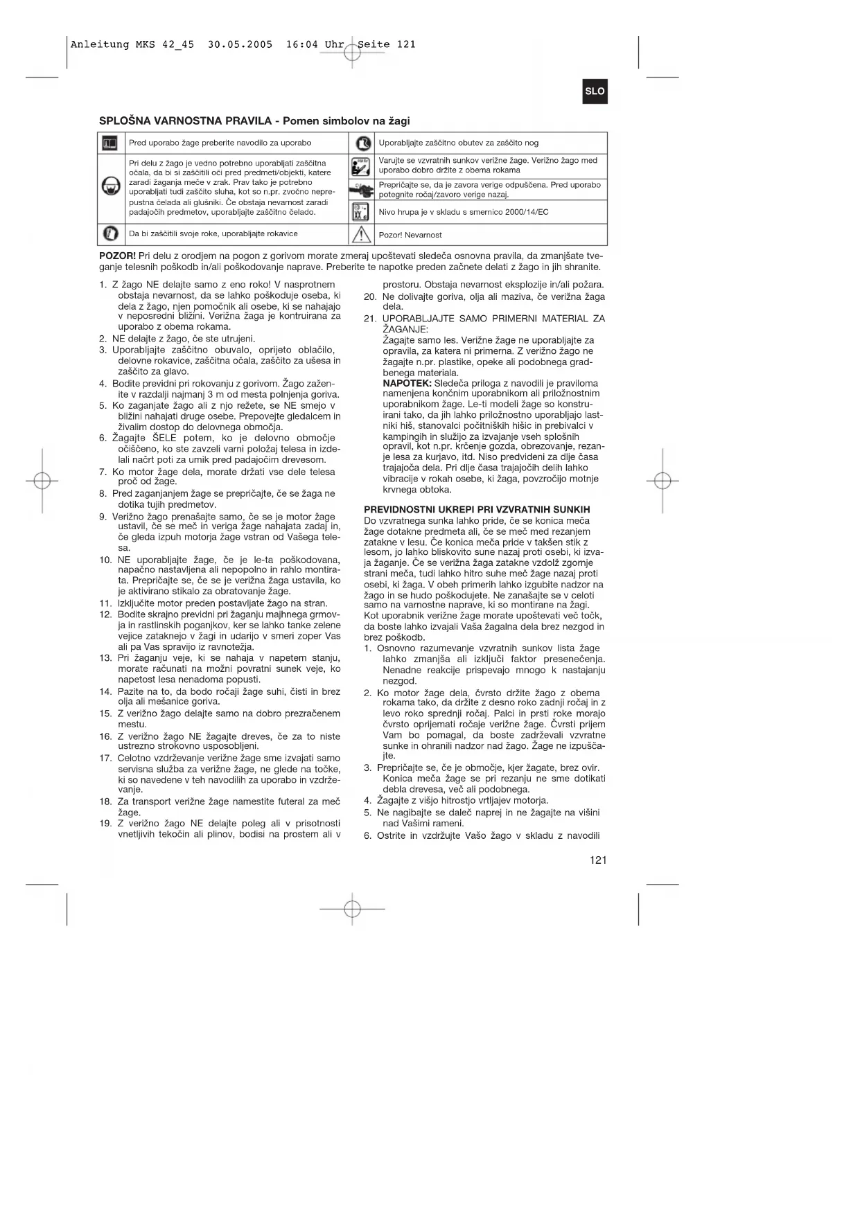 POZOR! Pri delu z orodjem na pogon z gorivom morate zmeraj upoštevati sledeča osnovna pravila, da zmanjšate tve- ganje telesnih poškodb in/ali poškodovanje naprave. Preberite te napotke preden začnete delati z žago in jih shranite. Anleitung MKS 42_45 30.05.2005 16:04 Uhr Seite 121SLO