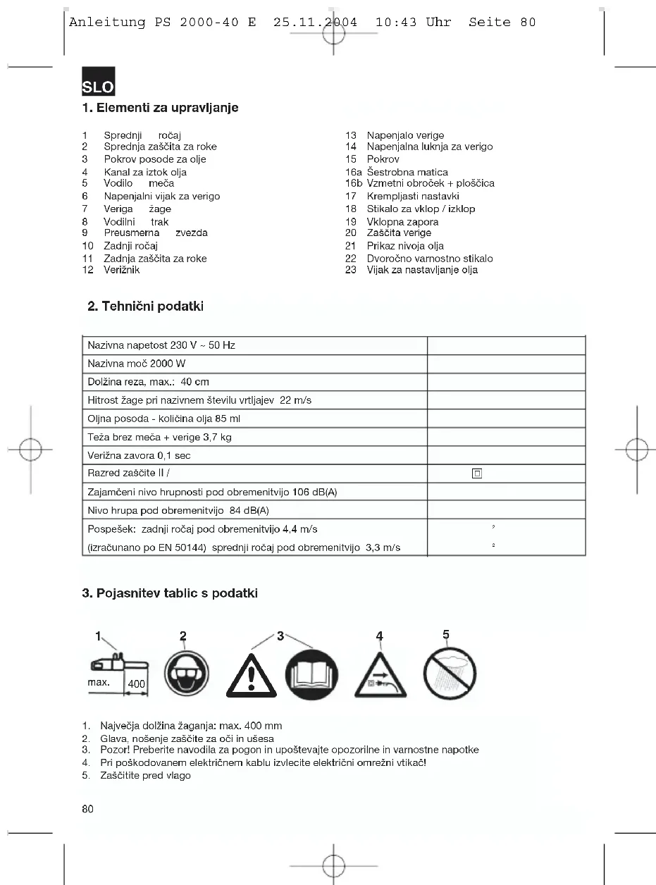 Anleitung PS 2000-40 E 25.11.2004 10:43 Uhr Seite 804. Varnostni napotki Pri uporabi žage je treba upoštevati var nostne napotke. Prosimo, če zaradi Vaše lastne varno sti ter varnosti drugih oseb upoštevate te napotke pred upor abo žage. Dobro shranite te napotke za kasnejšo uporabo. Električno verižno žago uporabljajte izključno samo za žaganje lesa (lesenih delov). Vsaki drugi način uporabe žage je Vaša lastna odgovornost in lahko predstavlja nevarnost. Proizvajalec ne odgovarja za škodo, ki bi nastala zaradi nenamenske uporabe ali sl bega rokovanja z žago. Varnostni napotki in zaščita pred nezgodo Prosimo, če skrbno preberete celotna navodila za uporabo pred prvim zagonom, da bi se izognili nepravilnemu rokovanju z verižno žago. Vsi napotki za rokovanje z veriž- no žago služijo zmeraj tudi Vaši osebni varnosti! Zaprosite strokovnjaka za praktična navodila! Pred sproščanjem verižne zavore izključite stroj. Uporabljajte zaščito za ušesa, da preprečite poškodbe sluha; najprimernejše so čelade z zaščito za obraz. Pri delu pazite na varni položaj telesa. Izključite stroj preden ga odložite. Pred izvajanjem del na stroju potegnite vtikač iz električne vtičnice. Vtikač priključite v vtičnico samo tako, da bo stroj izključeni. Z verižno žago sme delati samo ena oseba. Drugim osebam je prepovedano zadrževanje v delovnem območju žage. Posebej pazite na otroke in domače živali. Pri zagonu mora biti žaga v prostem položaju. Pri delu držite verižno žago z obema rokama! Otroci in mladostniki ne smejo uporabljati veriž- ne žage. Ta prepoved ne velja za mladostnike nad 16 let starosti, ki se šolajo pod nadzorom. Žago posojajte samo osebam, ki so v bistvenem seznanjene s to vrsto žage in z njeno uporabo. V vsakem primeru jim predajte tudi navodila za uporabo! Z verižno žago sme delati samo tisti, ki je spočit in zdrav, to pomeni v dobrem telesnem stanju. Če ste utrujeni od dela, si pravočasno vzemite odmor. Po zaužitju alkohola je prepovedano delati z verižno žago. Če začasno ne uporabljate stroja, ga odstavite tako, da ne bo mogel stroj nikogar ogrožati. Pred vsakim rezu čvrsto nastavite krempljasti nastavek in šele potem začnite žagati. Električni priključni kabel morate praviloma spel- jati izza osebe, ki žaga. Kabel zmeraj speljite proč nazaj izza stroja. Uporabljajte samo originalni pribor. Stroji, ki jih uporabljate na prostem, morajo biti priključeni preko varnostnega stikala za okvarni tok. Kabelski podaljšek na prostm: Na prostem upor- abljajte samo v ta namen dovoljene in ustrezno označene kabelske podaljške. Pri žaganju rezanega lesa in tankega lesa upora- bljajte varno podlago (žagalni podstavek, Slika 4). Lesa ne smete zlagati enega na drugega in druge osebe ga ne smejo držati in tudi z nogo ga ne smete držati. Okrogli les morate zavarovati. Pri delu na nagnjenem terenu zmeraj stojte v smeri pobočja. Žagalno pripravo vlecite iz lesa samo z delujočo žagalno verigo. Če izvajate več rezov, morate med rezi žago izključiti. Previdno pri rezanju razcepljenega lesa. Žaga lahko zagrabi koščke lesa (nevarnost poškodb!). Ne uporabljajte električne verižne žage za skobl- janje ali odstranjevanje lesnega materiala in dru- gih predmetov. Odrezovanje vej sme izvajati samo šolano oseb- je! Nevarnost poškodb! Brezpogojno pazite na veje, ki so v napetem stanju. Prosto viseče veje ne odrezujte od spo- daj. Pri odrezovanju vej ne stojte na deblu. Električne žage ne smete uporabljati za gozdar- ska dela, to pomeni za podiranje dreves in odre- zovanje vej na drevesih v gozdu. V takšnem pri- meru zaradi kabelske povezave ni zagotovljena potrebna okretnost in varnost osebe, ki žaga! Pri podiranu dreves se zadržujte samo ob strani padajočega drevesa. Pri pomikanju nazaj po izvršenem rezu pri podi- ranju morate paziti na padajoče veje. Pri delu na pobočju se mora oseba, ki žaga, nahajati nad ali ob strani debla oz. ležečega dre- vesa, ki ga žaga. Če se priključni kabel poškoduje, ga mora zamenjati proizvajalec ali njegova servisna služ- ba, da ne bi prišlo do ogrožanja varnosti. SLO