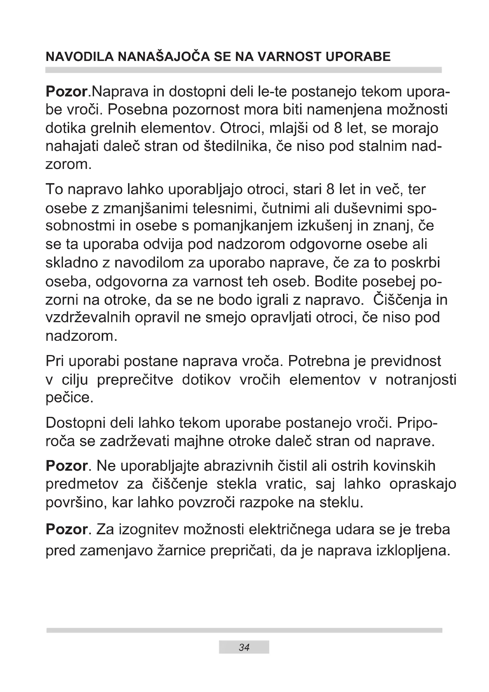 Hitro razgretje Vklopljeni termocirkulacija in opekač. Namenjeno za predhodno segretje pečice. Vklopljen spodnji grelnik V tem položaju zasučnega gumba deluje pečica samo z gretjem spodnje- ga grelnika. Dopolnilna peka testa s spodnje strani (npr. vlažno testo, testo s sadnim nadevom).48 UPORABA Pomembno! lTekom izvajanja hitrega razgrevanja se v komori pečice ne sme nahajati pekač s testom, kot tudi ne kakršni koli drugi elementi, ki niso del opreme pečice. Ne priporoča se koristiti funkcijo hitrega razgrevanja pri nastavljenem programer- ju. lTekom uporabe pečice se tvori vodna para. To je normalni zikalni pojav, pred- viden s strani naših konstruktorjev. Od- vaja se navzven skozi posebno izhodno odprtino, nahajajočo se na zadnji strani štedilnika. Kontrolne lučke Vklopljena sta zgornji in spodnji grelec Z nastavljenostjo zasučnega gumba v tem položaju se pečica segreva na konvencionalni način. Idealna je za peko peciva, mesa, rib, kruha, pic (nujno je predhodno razgreti pečico in uporabljati temne pekače), za peko na eni ravni. Vklopljena termocirkulacija Nastavitev zasučnega gumba v položaj „vklopljena termocirkulacija” omogoča realizacijo segrevanja pečice na prisilni način z uporabo termoventilatorja, nameščenega na centralnem mestu hrbtne strani ko- more pečice. Peka se izvaja pri nižjih temperaturah kot v primeru uporabe konvencionalne pečice. Uporaba tega načina segrevanja omo- goča enakomerno kroženje toplote okoli jedi, vmeščene v pečici. Vklopljeni ventilator, spodnji in zgornji grelec Pri tem položaju gumba opravlja peči- ca funkcijo testo. Tradicionalna pečica z ventilatorjem (priporočena funkcija tekom peke). Vklop pečice signalizira zasvetitev dveh kon- trolnih lučk, kontrolne lučke dela (vklopa) šte- dilnika R in kontrolne lučke termoregulatorja L. Svetenje kontrolne lučke R signalizira delo pečice. Ugasnitev kontrolne lučke L je znak, da je pečica dosegla nastavljeno temperatu- ro. Če kuharski recept zahteva vložitev jedi v razgreto pečico, se sme to narediti ne prej kot po prvi ugasnitivi rdeče kontrolne lučke L. Te- kom peke se lučka L občasno vklopi in izklopi (vzdrževanje temperature v komori pečice). Kontrolna lučka R se lahko sveti tudi, ko je zasučni gumb v položaju „Osvetlitev pečice”. Vklopljena termocirkulacija in spo- dnji grelec V tem položaju zasučnega gumba pečica izvaja funkcijo termocirkulacije in vklopljenega spodnjega grelca, kar povzroči dvig temperature na spodnji strani jedi v pečici. Veliko količino to- plote se dovede k spodnji strani jedi v pečici, primerno za mokro testo, pice. Neodvisna osvetlitev pečice Z nastavitvijo zasučnega gumba v ta položaj dobimo osvetlitev komore pečice. Kroženje vročega zraka eco Pri uporabi te funkcije se zažene racionalizirani način gretja, katerega namen je varčevanje z energijo med pripravljanjem jedi. Pri tem položaju zasučnega gumba je osvetlitev pečice izklopljena.49 UPORABA Za vklop opekača je treba: lnastaviti zasučni gumb pečice v položaj, označen s simbolom opekača, l segrevati pečico približno 5 minut (pri zaprtih vratih pečice). l vstaviti v pečico široki pekač na ustrezno delovno raven, v primeru peke na ražnju pa na raven neposredno pod ražnjem vstaviti kovinsko ploščo, ki zadržuje ka- pljajočo maščobo, lzapreti vrata pečice. Uporaba opekača Proces peke poteka tako, da na jed učinku- jejo IR žarki, ki jih oddaja razžarjeni grelec opekača. Pozor! Peko je treba izvajati pri zaprtih vratih pečice. Pri uporabi opekača lahko dostopni deli pečice postanejo vroči. Priporoča se preprečevati otrokom dostop do pečice. Za funkcijo peke in intenzivirane peke je treba temperaturo nastaviti maksimalno na 220