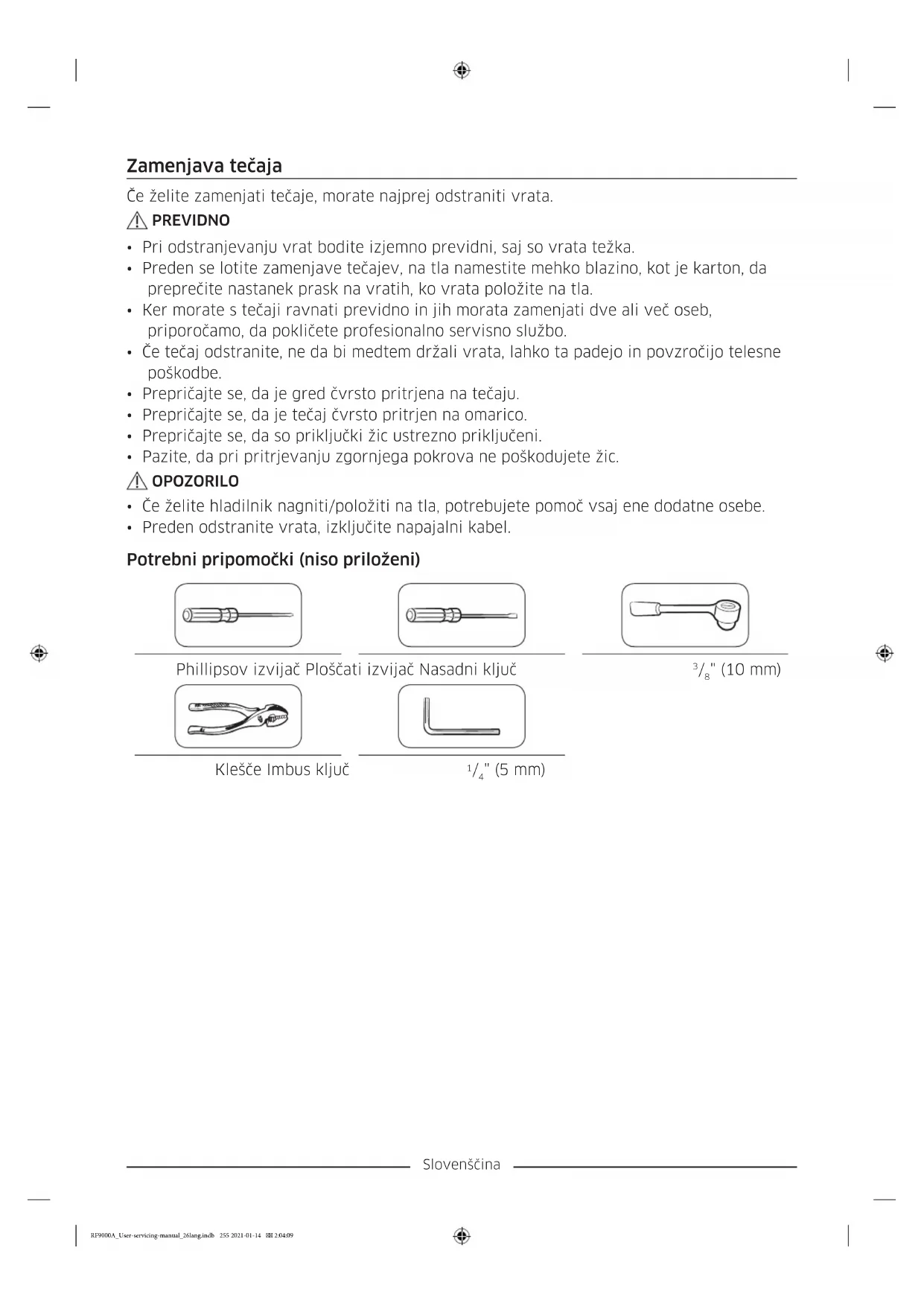 - Za ponovno namestitev vstavite predal v vodila okvirja in ga potisnite v notranjost. Ponovna namestitev predala Predale ponovno namestite, tako da sledite korakom odstranjevanja v obratnem vrstnem redu. RF9000A_User-servicing-manual_26lang.indb 254 2021-01-14 2:04:08Slovenščina Zamenjava tečaja Če želite zamenjati tečaje, morate najprej odstraniti vrata. PREVIDNO
