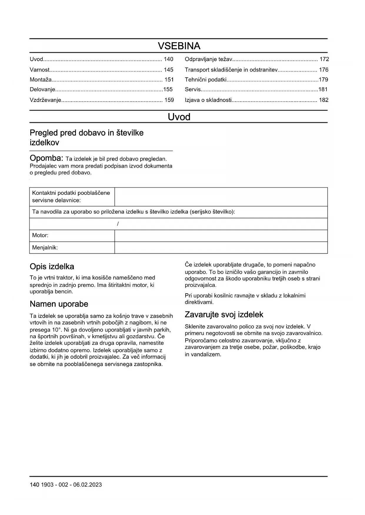 - Ne prevažajte potnikov. Izdelek sme uporabljati le ena oseba. 1903 - 002 - 06.02.2023 145• Izdelka ne pustite brez nadzora, če je vklopljen motor. Preden izdelek pustite brez nadzora, vedno ustavite rezila, aktivirajte parkirno zavoro, zaustavite motor in odstranite kontaktni ključ.