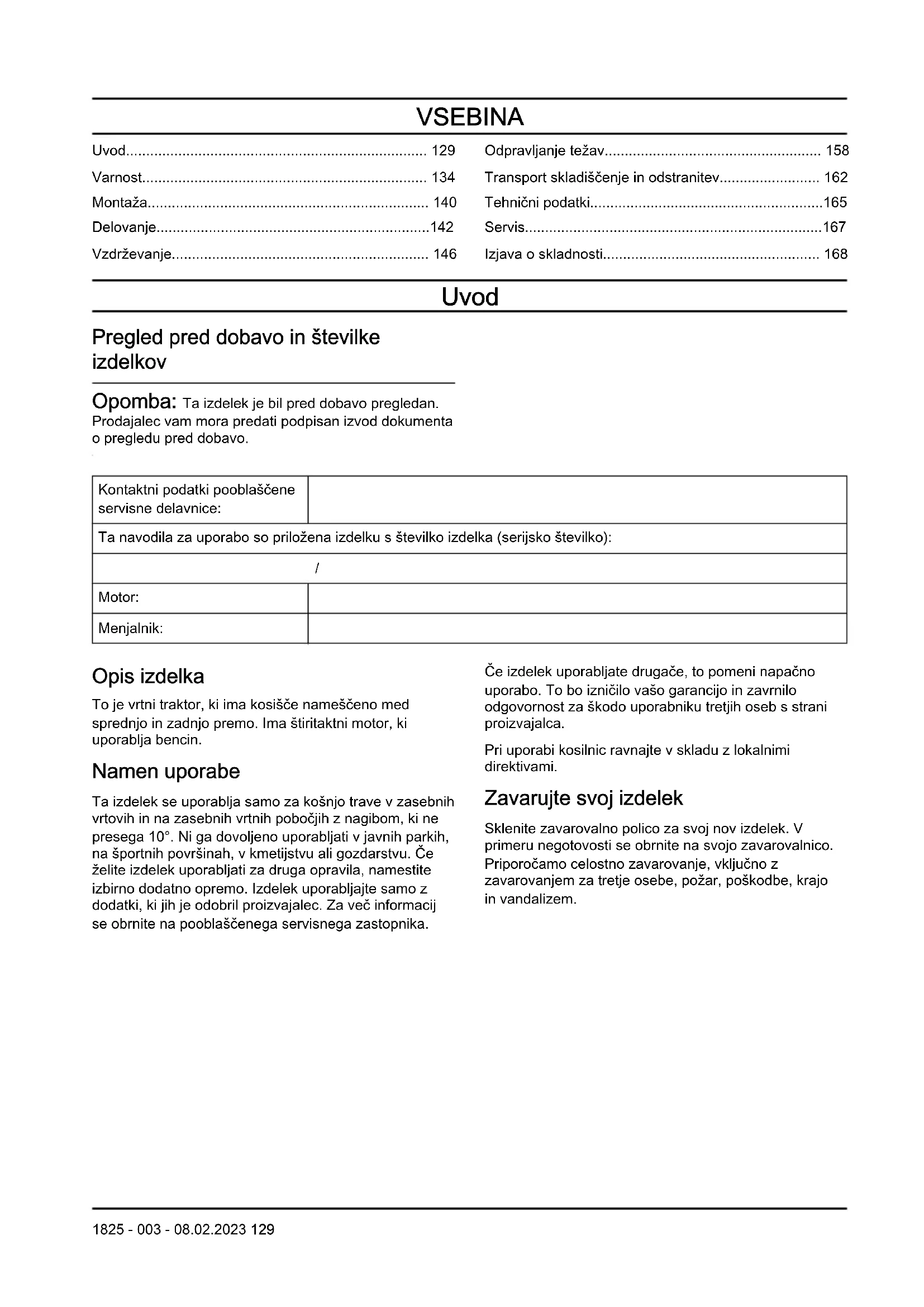 Motor: Menjalnik: Opis izdelka To je vrtni traktor, ki ima kosišče nameščeno med sprednjo in zadnjo premo. Ima štiritaktni motor, ki uporablja bencin. Namen uporabe Ta izdelek se uporablja samo za košnjo trave v zasebnih vrtovih in na zasebnih vrtnih pobočjih z nagibom, ki ne presega 10°. Ni ga dovoljeno uporabljati v javnih parkih, na športnih površinah, v kmetijstvu ali gozdarstvu. Če želite izdelek uporabljati za druga opravila, namestite izbirno dodatno opremo. Izdelek uporabljajte samo z dodatki, ki jih je odobril proizvajalec. Za več informacij se obrnite na pooblaščenega servisnega zastopnika. Če izdelek uporabljate drugače, to pomeni napačno uporabo. To bo izničilo vašo garancijo in zavrnilo odgovornost za škodo uporabniku tretjih oseb s strani proizvajalca. Pri uporabi kosilnic ravnajte v skladu z lokalnimi direktivami. Zavarujte svoj izdelek Sklenite zavarovalno polico za svoj nov izdelek. V primeru negotovosti se obrnite na svojo zavarovalnico. Priporočamo celostno zavarovanje, vključno z zavarovanjem za tretje osebe, požar, poškodbe, krajo in vandalizem. 1825 - 003 - 08.02.2023 129Pregled izdelka Pregled izdelka (TS 112)