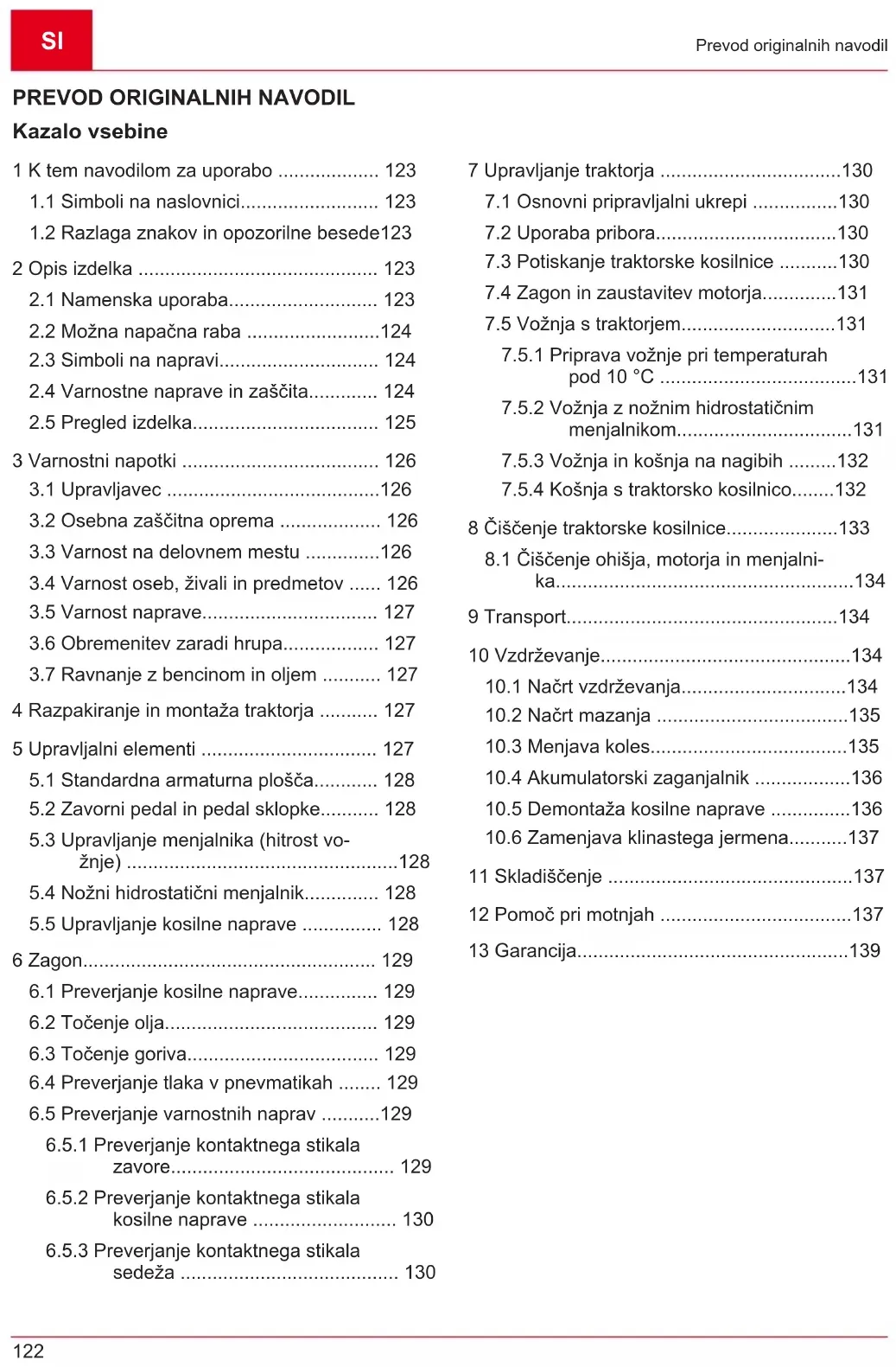 sekund, da se optimizira viskoznost olja me- njalnika. Nato lahko vozite traktor. Kosilno napravo vklopite šele po nekajminutnem de- lovanju motorja.