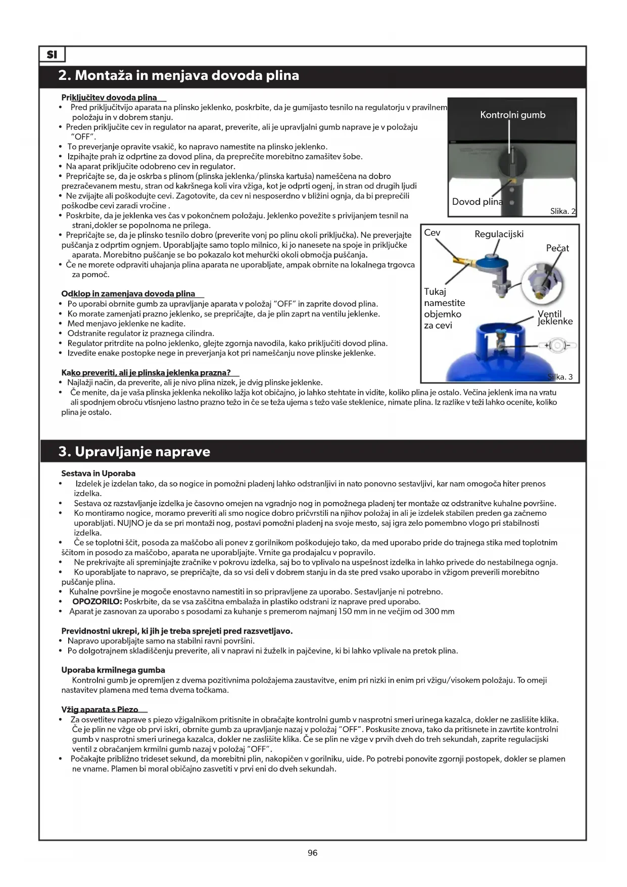 8600-102 5610-900 98302V Artikel Art.nr. 5610-300 5610-200 5610-400 203-1009393 Recikliranje embalaže. Embalažni material odložite v ustrezne zabojnike za recikliranje odpadkov, kjer koli je to mogoče. Razlaga simbolov SI9494 POZOR Poskrbite za zadostno prezračevanje. Ta plinska naprava uporablja zrak (kisik). Aparata ne uporabljajte v neprezračenem prostoru. Če še vedno več plinske naprave in / ali potniki, ki uporabljajo plin dodan prostor, je treba zagotoviti dodatno prezračevanje. Če so prostoru dodane kakršne koli naprave, ki uporabljajo plin, je treba zagotoviti dodatno prezračevanje. POMEMBNO Pozorno preberite navodila, da se seznanite z napravo pred priključitvijo aparata z jeklenko. Navodila shranite za poznejšo uporabo.