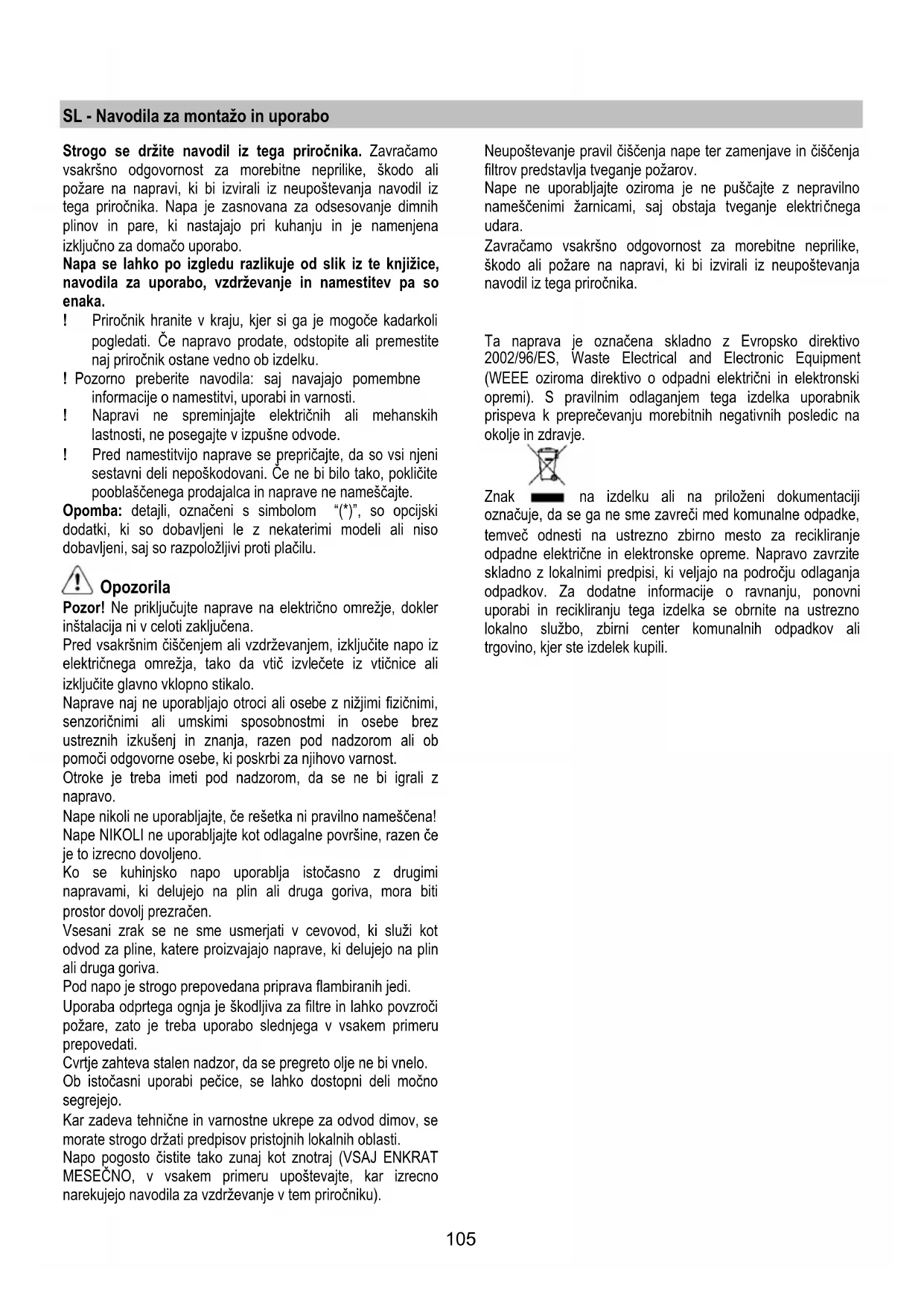 Ta naprava je označena skladno z Evropsko direktivo 2002/96/ES, Waste Electrical and Electronic Equipment (WEEE oziroma direktivo o odpadni električni in elektronski opremi). S pravilnim odlaganjem tega izdelka uporabnik prispeva k preprečevanju morebitnih negativnih posledic na okolje in zdravje. Znak na izdelku ali na priloženi dokumentaciji označuje, da se ga ne sme zavreči med komunalne odpadke, temveč odnesti na ustrezno zbirno mesto za recikliranje odpadne električne in elektronske opreme. Napravo zavrzite skladno z lokalnimi predpisi, ki veljajo na področju odlaganja odpadkov. Za dodatne informacije o ravnanju, ponovni uporabi in recikliranju tega izdelka se obrnite na ustrezno lokalno službo, zbirni center komunalnih odpadkov ali trgovino, kjer ste izdelek kupili.106 Uporaba Napa je izdelana za uporabo v odzračevalni različici z zunanjim odvodom ali obtočni oz. filtracijski z notranjim obtokom. Odzračevalna različica Hlapi so usmerjeni navzven po odvodni cevi, ki je pritrjena na priključno prirobnico. Premer odvodne cevi mora biti enak premeru spojnega obročka. Pozor! Odvodna cev ni priložena napi in jo je potrebno kupiti ločeno. V horizontalnem odseku mora biti cev rahlo nagnjena navzgor (približno 10°), tako da zrak lažje izhaja navzven. Če je napa opremljena z oglenimi filtri, je slednje potrebno odstraniti. Povežite napo s cevmi in odprtinami z vodoravnim odtokom enakega premera kot je premer izhoda za zrak (spojna prirobnica). Uporaba cevi in odprtin z vodoravnim odtokom, ki imajo manjši premer, bo vplivala na zmanjšanje uèinkov sesanja in moèno poveèala hrupnost. Zato za tako delovanje odklanjamo vsakršno odgovornost. ! Cevovod naj bo dolg toliko, kolikor znaša najmanjša nujna dolžina. ! Cevovod naj ima čim manj krivin (največji kot upogiba: 90°). ! Izogibajte se izrazitim spremembam smeri cevovoda. ! Notranjost cevovoda naj bo čim bolj gladka. ! Material, iz katerega je izdelan cevovod, mora biti skladen z normativi. Obtočna različica Iz vsesanega zraka so pred ponovnim vnosom v prostor odstranjeni maščoba in neprijetne vonjave. Pri uporabi nape v tej izvedbi je potrebno namestiti dodatni filter na osnovi aktivnega oglja. Modeli brez sesalnega motorja delujejo le v odzračevalni različici in morajo biti povezani na periferno sesalno enoto (ni priložena). Navodila za prikljuèitev veljajo za celotno periferno sesalno enoto. Inštalacija Minimalna razdalja med podporno površino posod na kuhalni površini in spodnjim delom nape za kuhinjske prostore ne sme biti manjša od 50cm pri električnih štedilnikih in 65cm pri plinskih ali mešanih štedilnikih. Če je v navodilih za instalacijo plinskega kuhalnika napisana večja razdalja, jo je treba tudi upoštevati.