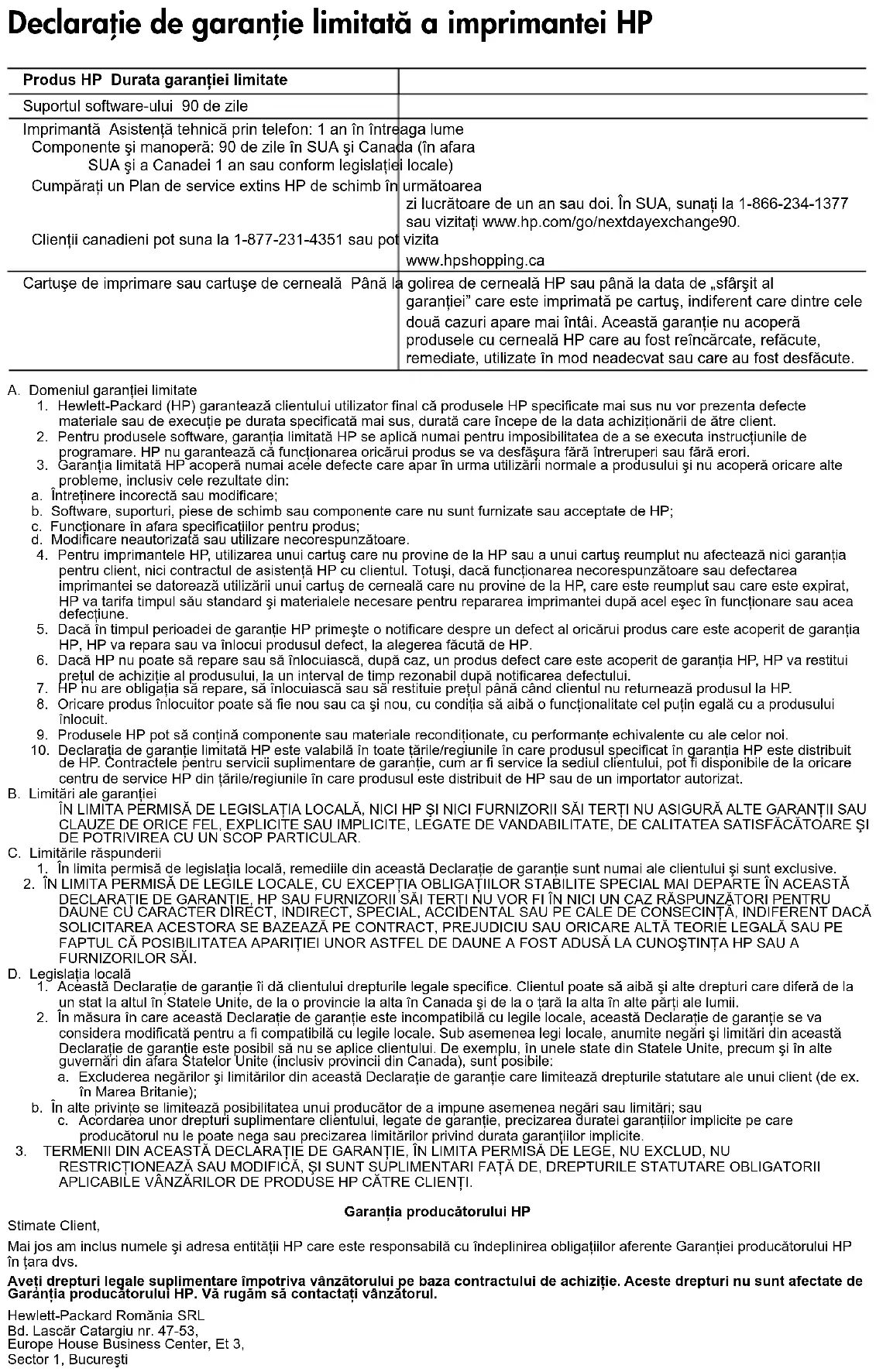 OMEJUJEJO ALI SPREMINJAJO OBVEZNIH ZAKONSKIH PRAVIC, KI VELJAJO ZA PRODAJO HP-JEVIH IZDELKOV KUPCEM, AMPAK TE ZAKONSKE PRAVICE DOPOLNJUJEJO. Informacije o HP-jevi omejeni garanciji Spoštovani, V prilogi vam pošiljamo imena in naslove HP-jevih skupin, pri katerih lahko v svoji državi uveljavljate HP-jevo omejeno garancijo (garancijo proizvajalca). Poleg garancije proizvajalca imate lahko na osnovi nakupne pogodbe tudi z zakonom predpisane pravice do prodajalca, ki jih ne omejuje ta garancija proizvajalca. Slovenija: Hewlett-Packard d.o.o., Tivolska cesta 48, 1000 Ljubljana HP izdelek Trajanje omejene garancije Mediji s programsko opremo 90 dni Tiskalnik Tehnična podpora po telefonu: 1 leto po vsem svetu Deli in delo: 90 dni v ZDA in Kanadi (zunaj ZDA in Kanade 1 leto oz. kot določa lokalna zakonodaja) Kupite enoletni ali dvoletni dodatni storitveni paket HP Next Business Day Exchange. V ZDA pokličite na tel. št.: 1-866-234-1377 ali obiščite spletno stran www.hp.com/go/nextdayexchange90. Stranke v Kanadi pokličite na tel. št.: 1-877-231-4351 ali obiščite spletno stran www.hpshopping.ca Tiskalne kartuše ali kartuše s črnilom Dokler HP črnilo ni porabljeno ali do datuma izteka garancije, ki je natisnjen na kartuši - kar nastopi prej. Garancija ne zajema izdelkov s HP črnilom, ki so bili ponovno napolnjeni, predelani, obnovljeni, napačno uporabljeni ali drugače spremenjeni. Izjava o omejeni garanciji za tiskalnik HPSvart bläckpatronTrefärgsbläckpatron