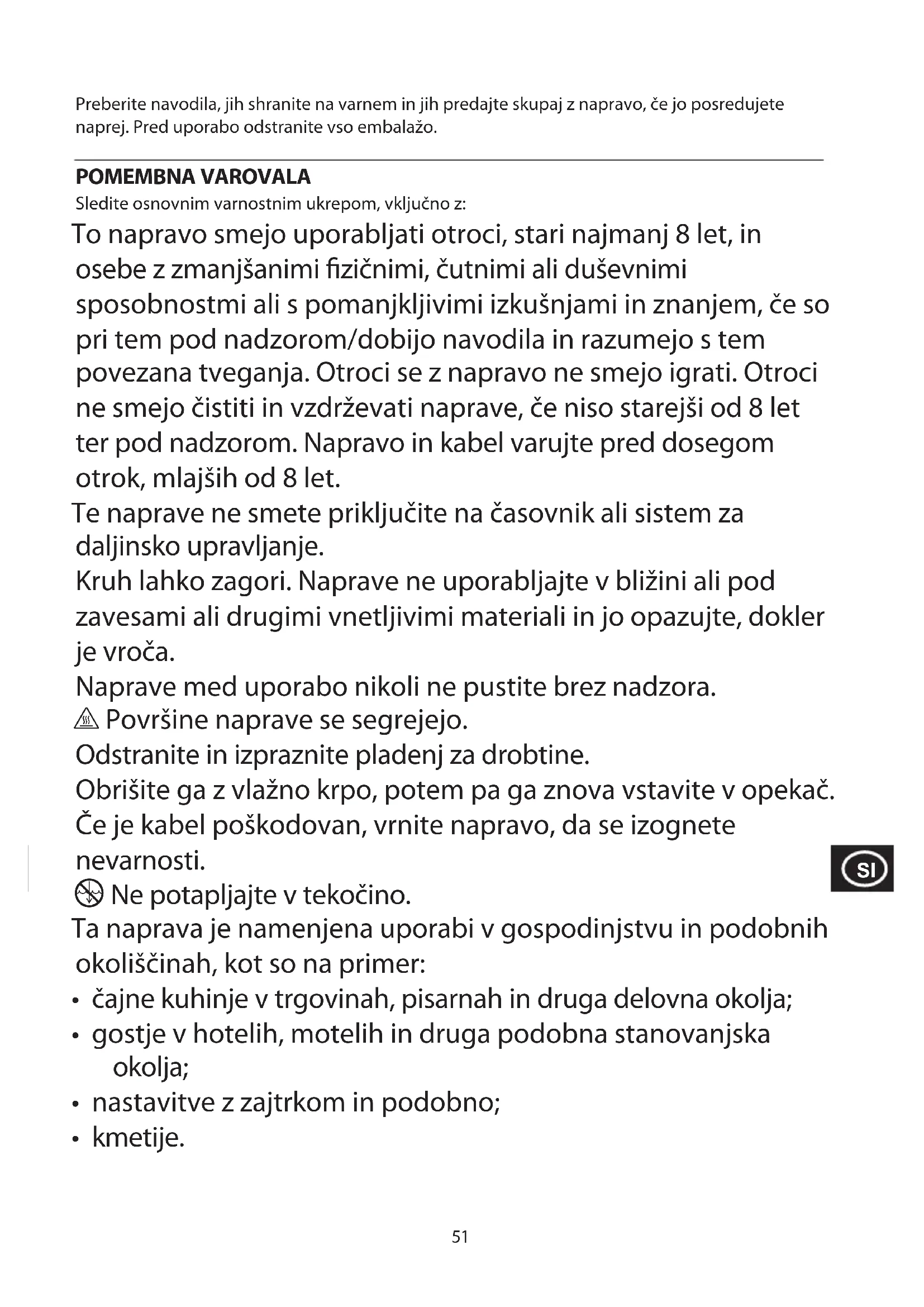 - Nikoli ne uporabljajte noža, vilice ali kakšnega drugega pripomočka, da odstranite zagozden kruh. Lahko poškodujete opekač, poleg tega pa obstaja nevarnost električnega šoka! DELI