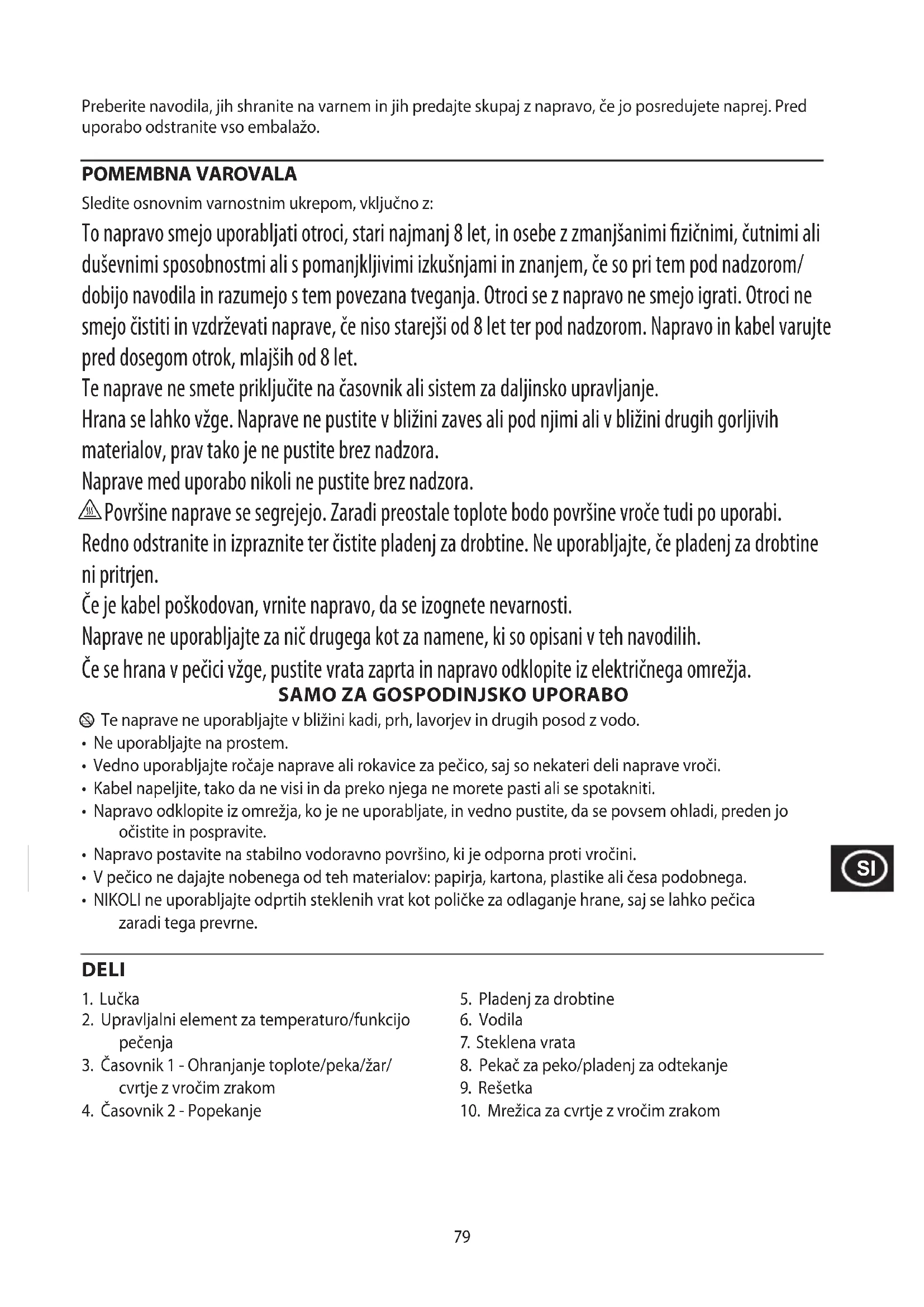 Površine naprave se segrejejo. Zaradi preostale toplote bodo površine vroče tudi po uporabi. Redno odstranite in izpraznite ter čistite pladenj za drobtine. Ne uporabljajte, če pladenj za drobtine ni pritrjen. Če je kabel poškodovan, vrnite napravo, da se izognete nevarnosti. Naprave ne uporabljajte za nič drugega kot za namene, ki so opisani v teh navodilih. Če se hrana v pečici vžge, pustite vrata zaprta in napravo odklopite iz električnega omrežja.