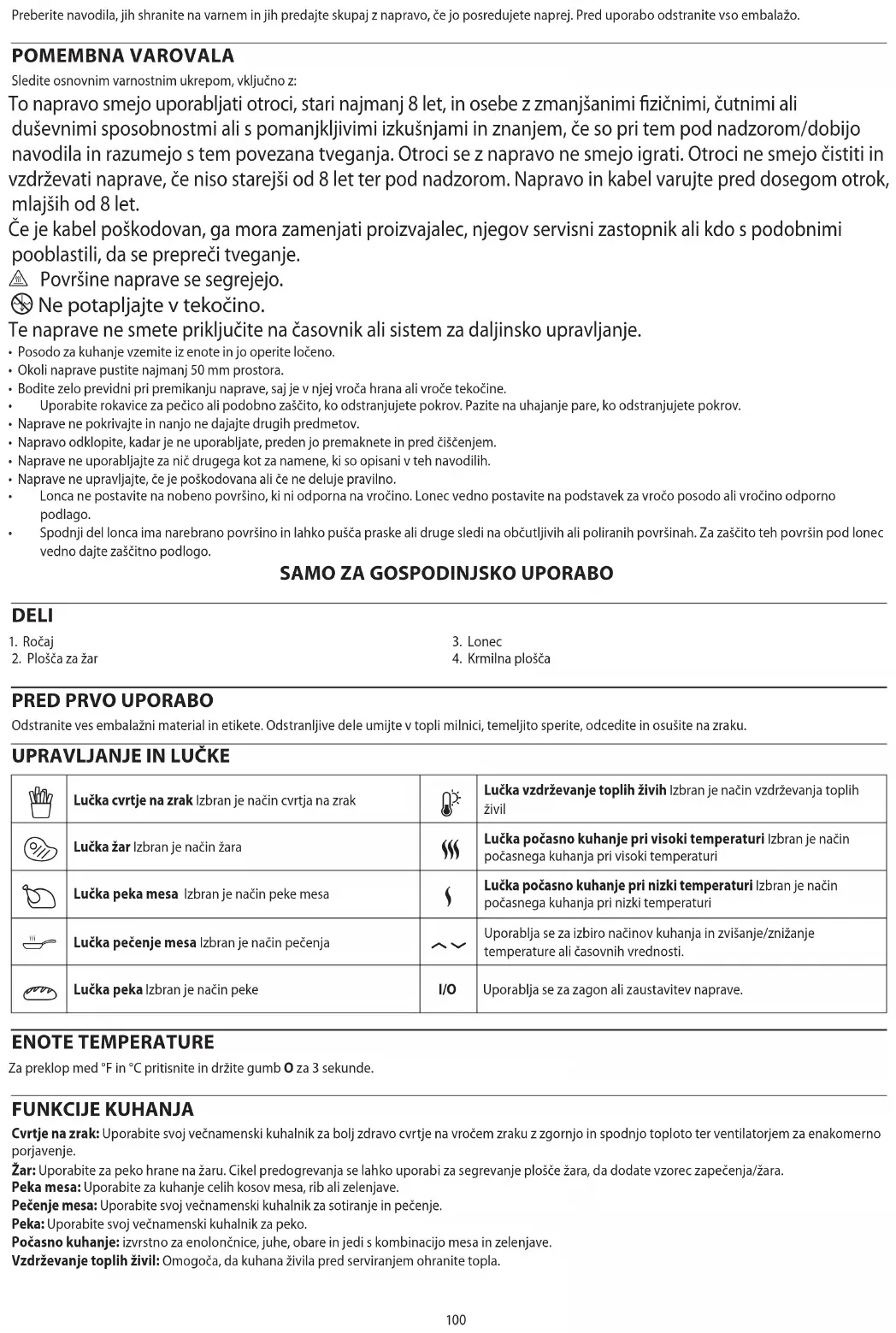 - POMEMBNO: Nastavitve vzdrževanja toplih živil ne uporabljajte za kuhanje. Uporabljajte samo za vzdrževanje toplote živil, ki so že vroča.