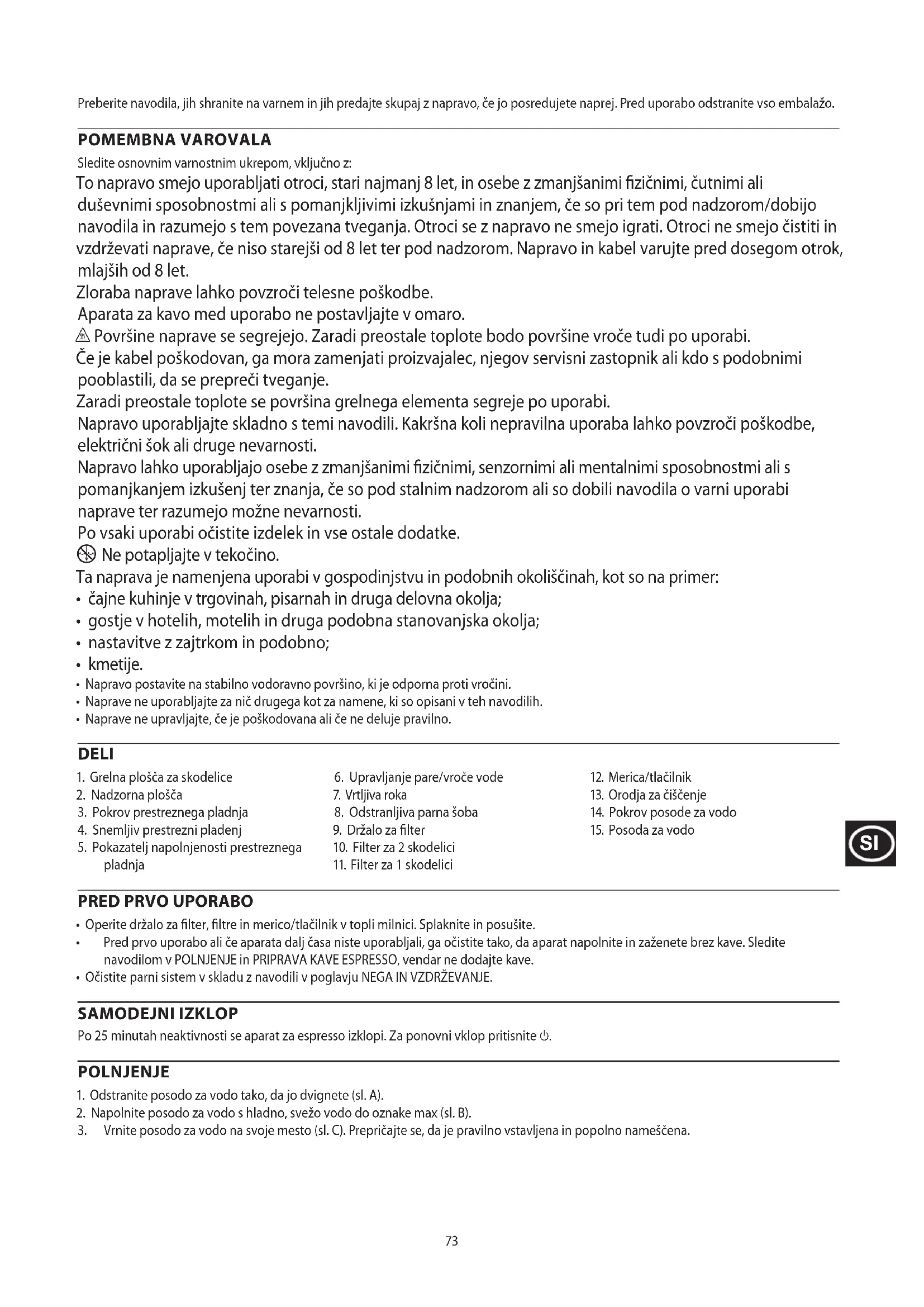 TKako bi se izbjegle štetne posljedice na okoliš i zdravlje zbog opasnih supstanci, uređaji i punjive i nepunjive baterije obilježene jednim od ovih simbola ne smiju se zbrinjavati kao nerazvrstani komunalni otpad. Uvijek odložite električne i elektroničke proizvode i , gdje je primjenljivo, punjive i nepunjive baterije, u odgovarajućem zvaničnom mjestu za sakupljanje/reciklažu.73 Preberite navodila, jih shranite na varnem in jih predajte skupaj z napravo, če jo posredujete naprej. Pred uporabo odstranite vso embalažo. POMEMBNA VAROVALA Sledite osnovnim varnostnim ukrepom, vključno z: To napravo smejo uporabljati otroci, stari najmanj 8 let, in osebe z zmanjšanimi fizičnimi, čutnimi ali duševnimi sposobnostmi ali s pomanjkljivimi izkušnjami in znanjem, če so pri tem pod nadzorom/dobijo navodila in razumejo s tem povezana tveganja. Otroci se z napravo ne smejo igrati. Otroci ne smejo čistiti in vzdrževati naprave, če niso starejši od 8 let ter pod nadzorom. Napravo in kabel varujte pred dosegom otrok, mlajših od 8 let. Zloraba naprave lahko povzroči telesne poškodbe. Aparata za kavo med uporabo ne postavljajte v omaro. h Površine naprave se segrejejo. Zaradi preostale toplote bodo površine vroče tudi po uporabi. Če je kabel poškodovan, ga mora zamenjati proizvajalec, njegov servisni zastopnik ali kdo s podobnimi pooblastili, da se prepreči tveganje. Zaradi preostale toplote se površina grelnega elementa segreje po uporabi. Napravo uporabljajte skladno s temi navodili. Kakršna koli nepravilna uporaba lahko povzroči poškodbe, električni šok ali druge nevarnosti. Napravo lahko uporabljajo osebe z zmanjšanimi fizičnimi, senzornimi ali mentalnimi sposobnostmi ali s pomanjkanjem izkušenj ter znanja, če so pod stalnim nadzorom ali so dobili navodila o varni uporabi naprave ter razumejo možne nevarnosti. Po vsaki uporabi očistite izdelek in vse ostale dodatke.