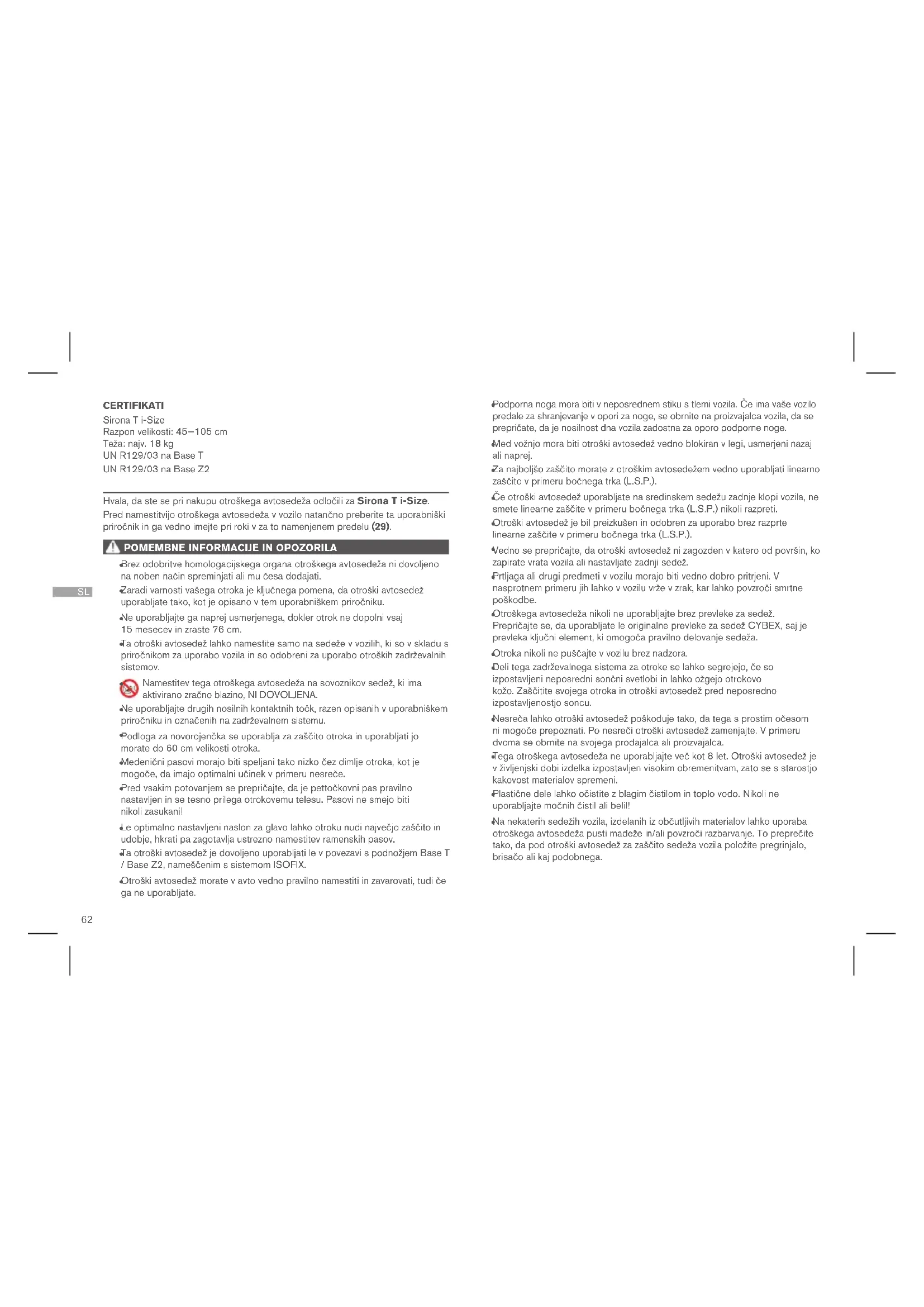 Otroški avtosedež morate v avto vedno pravilno namestiti in zavarovati, tudi če ga ne uporabljate. CERTIFIKATI Sirona T i-Size Razpon velikosti: 45−105 cm Teža: najv. 18 kg UN R129/03 na Base T UN R129/03 na Base Z2