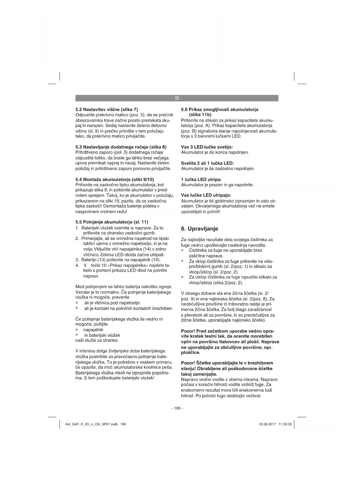 Naprava je namenjena odstranjevanju plevela iz fug med tlakovci in ploščami. Ni namenjena za uporabo na občutljivih površinah, kot so na primer ploščice. Naprave za zasebni domač in ljubiteljski vrt so tis- te naprave, ki se ne uporabljajo v javnih nasadih, parkih, na športnih igriščih ter v kmetijstvu in goz- darstvu. Upoštevanje priloženih proizvajalčevih navodil za uporabo je pogoj za pravilno uporabo naprave. Ta stroj se lahko uporablja le v skladu z njeg- ovo namembnostjo. Vsaka druga uporaba šteje kot nenamenska nedovoljena uporaba. Za kakršnekoli poškodbe ali škodo, ki bi nastale zaradi nedovoljene uporabe, nosi odgovornost uporabnik/upravljalec in ne proizvajalec. Anl_GAF_E_20_Li_OA_SPK7.indb 104Anl_GAF_E_20_Li_OA_SPK7.indb 104 03.08.2017 11:30:3403.08.2017 11:30:34SI