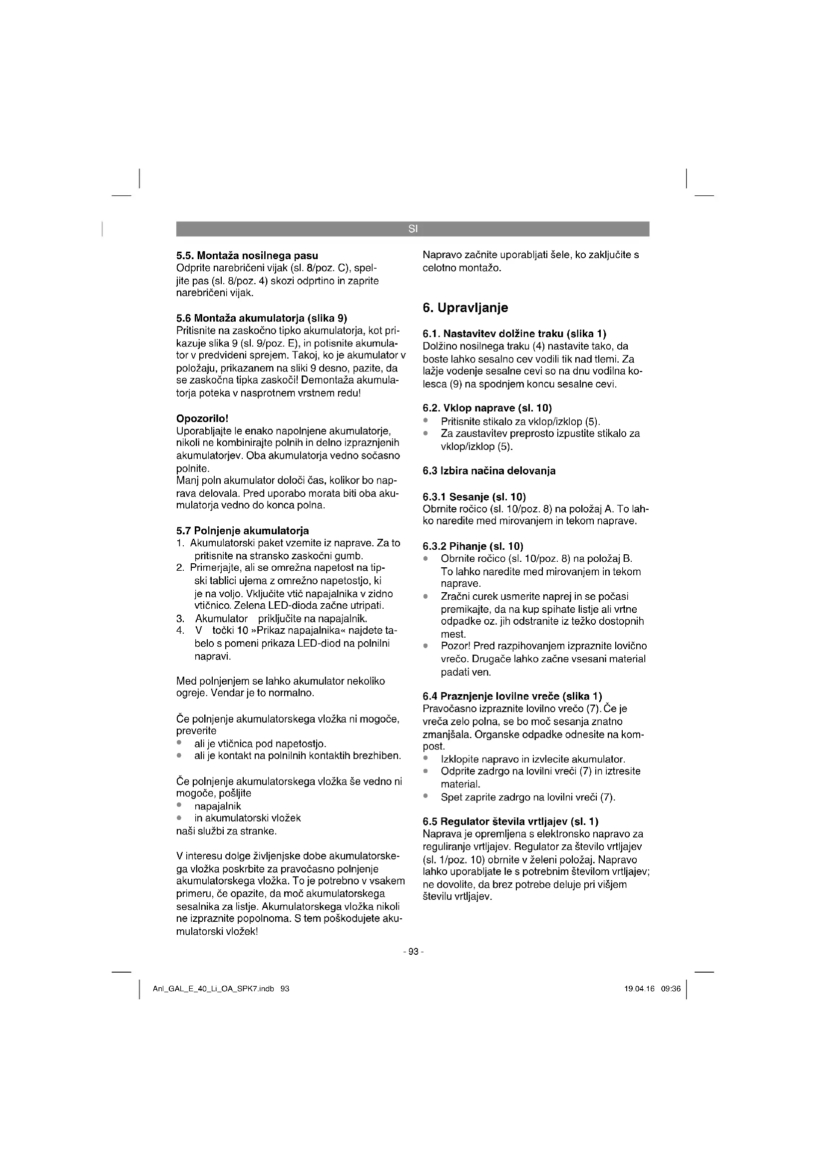 Naprava je opremljena s elektronsko napravo za reguliranje vrtljajev. Regulator za število vrtljajev (sl. 1/poz. 10) obrnite v želeni položaj. Napravo lahko uporabljate le s potrebnim številom vrtljajev; ne dovolite, da brez potrebe deluje pri višjem številu vrtljajev. Anl_GAL_E_40_Li_OA_SPK7.indb 93Anl_GAL_E_40_Li_OA_SPK7.indb 93 19.04.16 09:3619.04.16 09:36SI