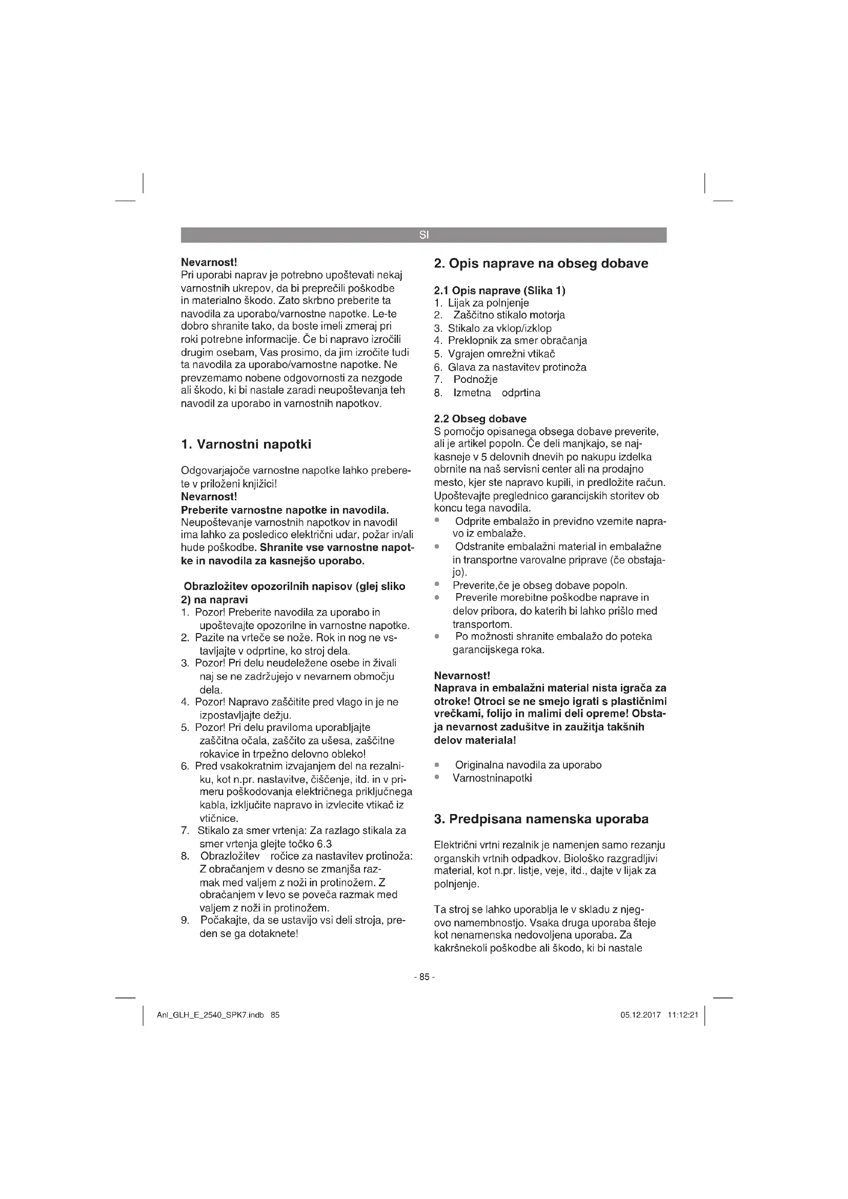 Električni vrtni rezalnik je namenjen samo rezanju organskih vrtnih odpadkov. Biološko razgradljivi material, kot n.pr. listje, veje, itd., dajte v lijak za polnjenje. Ta stroj se lahko uporablja le v skladu z njeg- ovo namembnostjo. Vsaka druga uporaba šteje kot nenamenska nedovoljena uporaba. Za kakršnekoli poškodbe ali škodo, ki bi nastale Anl_GLH_E_2540_SPK7.indb 85Anl_GLH_E_2540_SPK7.indb 85 05.12.2017 11:12:2105.12.2017 11:12:21SI