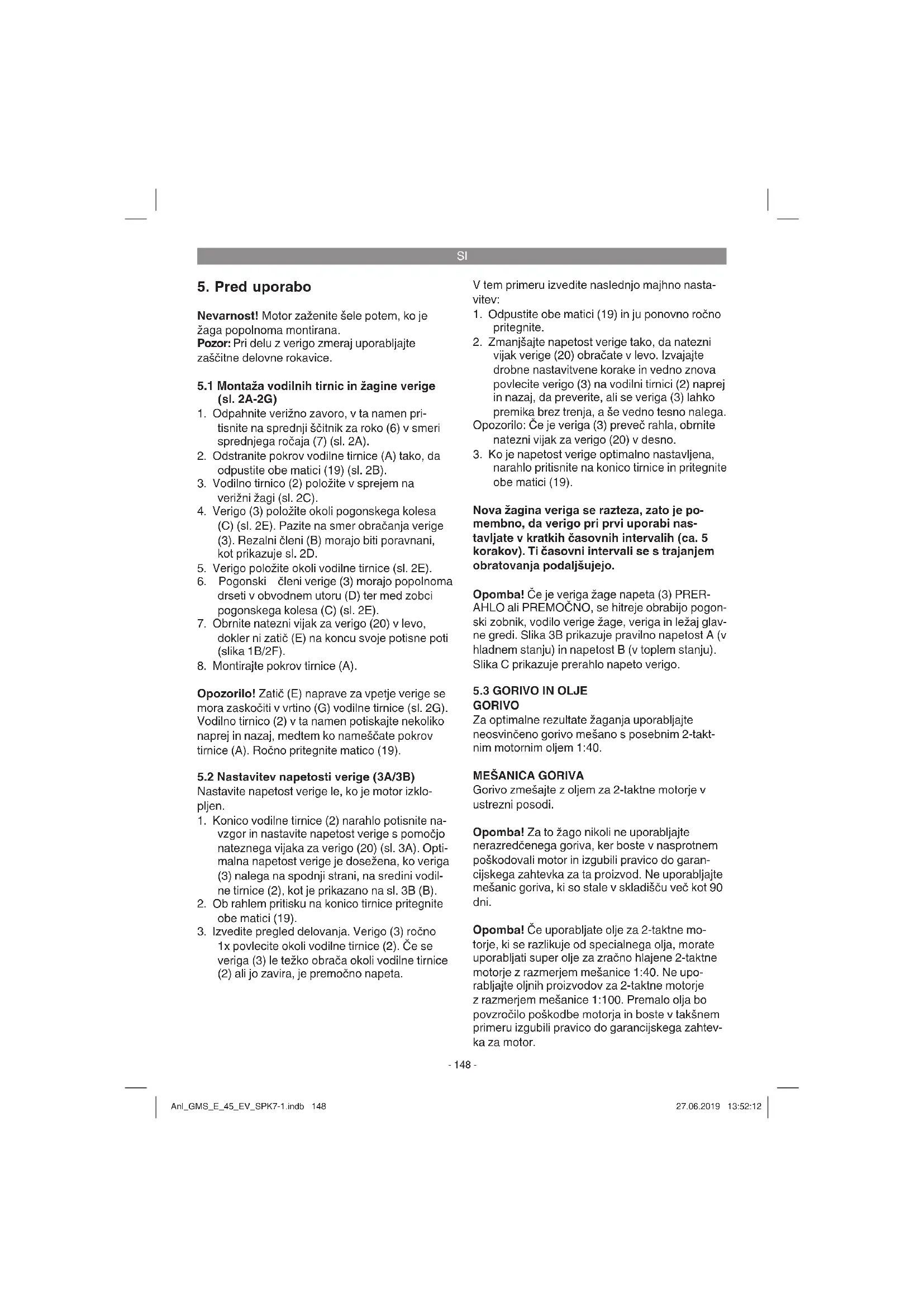 Gorivo zmešajte z oljem za 2-taktne motorje v ustrezni posodi. Opomba! Za to žago nikoli ne uporabljajte nerazredčenega goriva, ker boste v nasprotnem poškodovali motor in izgubili pravico do garan- cijskega zahtevka za ta proizvod. Ne uporabljajte mešanic goriva, ki so stale v skladišču več kot 90 dni. Opomba! Če uporabljate olje za 2-taktne mo- torje, ki se razlikuje od specialnega olja, morate uporabljati super olje za zračno hlajene 2-taktne motorje z razmerjem mešanice 1:40. Ne upo- rabljajte oljnih proizvodov za 2-taktne motorje z razmerjem mešanice 1:100. Premalo olja bo povzročilo poškodbe motorja in boste v takšnem primeru izgubili pravico do garancijskega zahtev- ka za motor. Anl_GMS_E_45_EV_SPK7-1.indb 148Anl_GMS_E_45_EV_SPK7-1.indb 148 27.06.2019 13:52:1227.06.2019 13:52:12SI