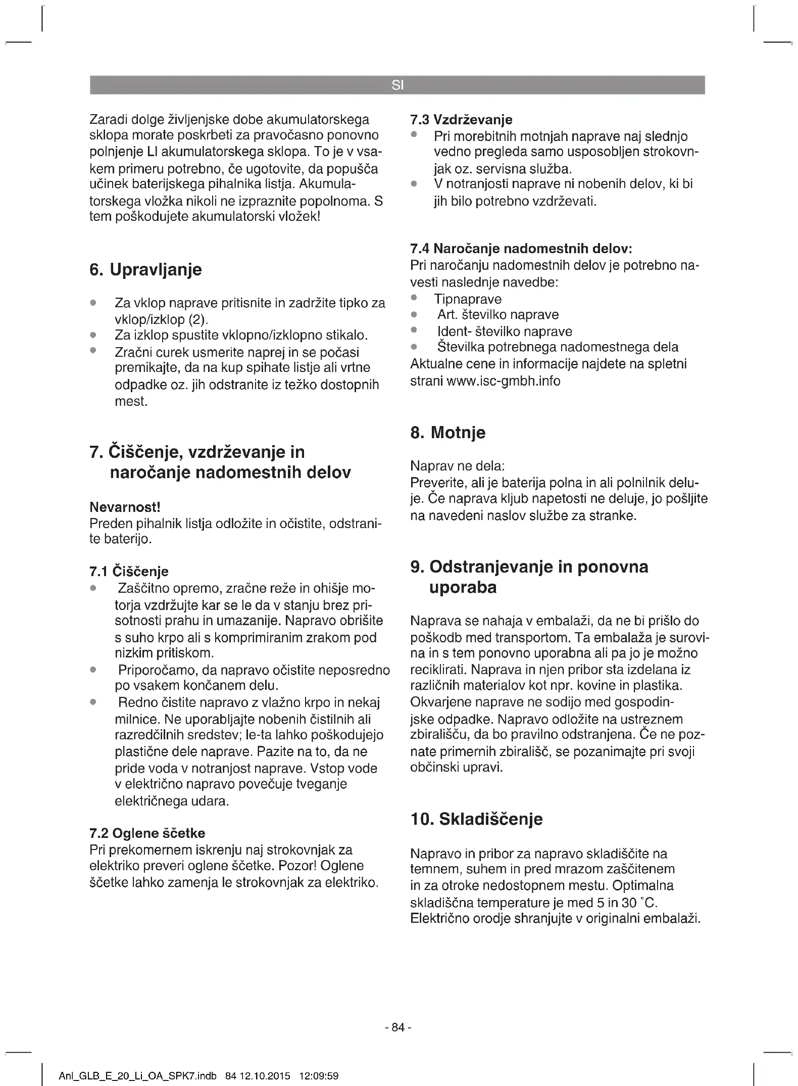 Samo za dežele EU Električnega orodja ne mečite med gospodinjske odpadke! V skladu z evropsko smernico 2012/19/EG o starih električnih in elektronskih napravah in v skladu z iz- vajanjem nacionalne zakonodaje morate ločeno zbirati izrabljena električna orodja in jih predati v okoljs- ko varno ponovno predelavo. Reciklažna alternativa za poziv za vračanje: Lastnik električne naprave je alternativno zavezan, da namesto vračanja sodeluje pri pri strokovno ustreznem recikliranju v primeru predaje lastnine. Staro napravo se lahko v ta namen tudi prepusti na odvzemnem mestu, ki izvaja odstranjevanje v smislu nacionalne zakonodaje o odstranjevanju takšnih odpadkov. To se ne nanaša na starim napravam priložene dele pribora in opreme brez električnih kom- ponent. Ponatis ali kakršnokoli razmnoževanje dokumentacije in spremljajočih papirjev o proizvodu, tudi po izvlečkih, je dovoljeno samo z izrecnim soglasjem ISC GmbH. Pridržana pravica do tehničnih sprememb Anl_GLB_E_20_Li_OA_SPK7.indb 86 12.10.2015 12:09:59SI