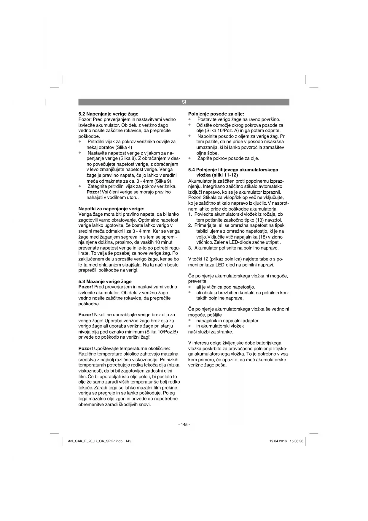 in akumulatorski vložek naši službi za stranke. V interesu dolge življenjske dobe baterijskega vložka poskrbite za pravočasno polnjenje litijske- ga akumulatorskega vložka. To je potrebno v vsa- kem primeru, če opazite, da moč akumulatorske verižne žage peša. Anl_GAK_E_20_Li_OA_SPK7.indb 145Anl_GAK_E_20_Li_OA_SPK7.indb 145 19.04.2016 15:06:3619.04.2016 15:06:36SI