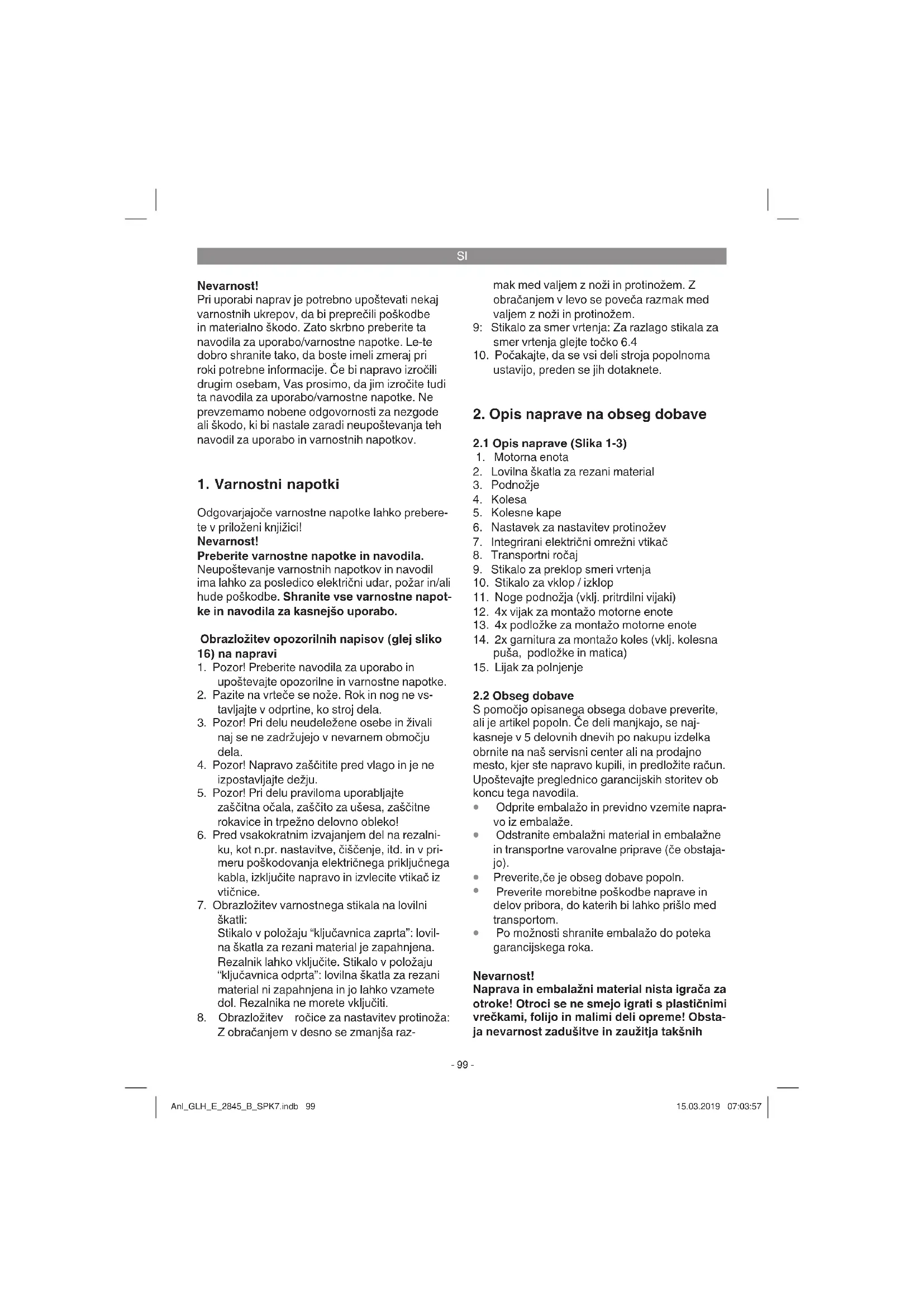 Po možnosti shranite embalažo do poteka garancijskega roka. Nevarnost! Naprava in embalažni material nista igrača za otroke! Otroci se ne smejo igrati s plastičnimi vrečkami, folijo in malimi deli opreme! Obsta- ja nevarnost zadušitve in zaužitja takšnih Anl_GLH_E_2845_B_SPK7.indb 99Anl_GLH_E_2845_B_SPK7.indb 99 15.03.2019 07:03:5715.03.2019 07:03:57SI