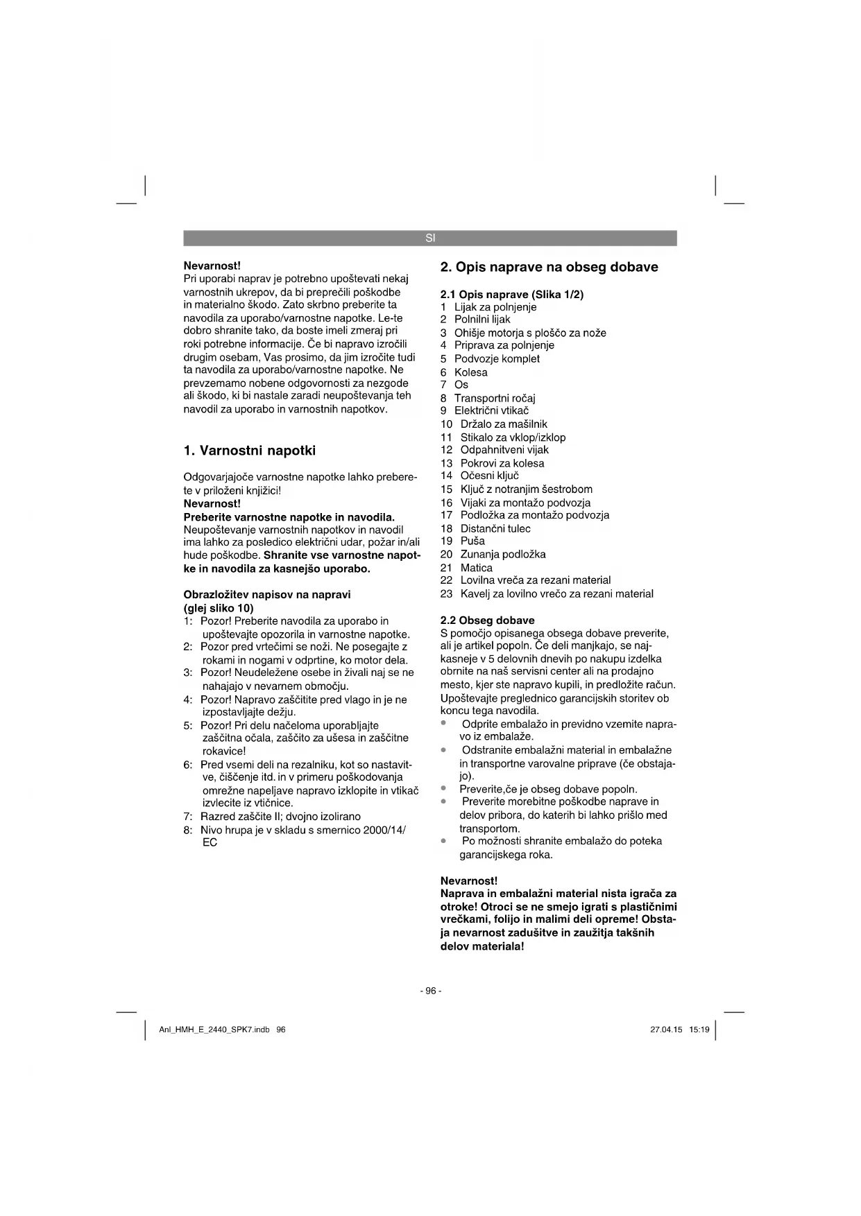 Samo za dežele EU Električnega orodja ne mečite med gospodinjske odpadke! V skladu z evropsko smernico 2002/96/EG o starih električnih in elektronskih napravah in v skladu z iz- vajanjem nacionalne zakonodaje morate ločeno zbirati izrabljena električna orodja in jih predati v okoljs- ko varno ponovno predelavo. Reciklažna alternativa za poziv za vračanje: Lastnik električne naprave je alternativno zavezan, da namesto vračanja sodeluje pri pri strokovno ustreznem recikliranju v primeru predaje lastnine. Staro napravo se lahko v ta namen tudi prepusti na odvzemnem mestu, ki izvaja odstranjevanje v smislu nacionalne zakonodaje o odstranjevanju takšnih odpadkov. To se ne nanaša na starim napravam priložene dele pribora in opreme brez električnih kom- ponent. Ponatis ali kakršnokoli razmnoževanje dokumentacije in spremljajočih papirjev o proizvodu, tudi po izvlečkih, je dovoljeno samo z izrecnim soglasjem ISC GmbH. Pridržana pravica do tehničnih sprememb Naprava lahko pri neugodnih omrežnih razmerah povzroči prehodna znižanja napetosti. Če je omrežna impendanca na priključitveni točki na javno omrežje večja kot 0,391 Ω, bodo morda potrebni dodatni ukrepi, preden lahko napravo uporabite na tem priključku v skladu z namenom uporabe. Po potrebi se lahko pri krajevnem podjetju za oskrbo z energijo pozanimate o impedanci. Anl_HMH_E_2440_SPK7.indb 101Anl_HMH_E_2440_SPK7.indb 101 27.04.15 15:1927.04.15 15:19SI