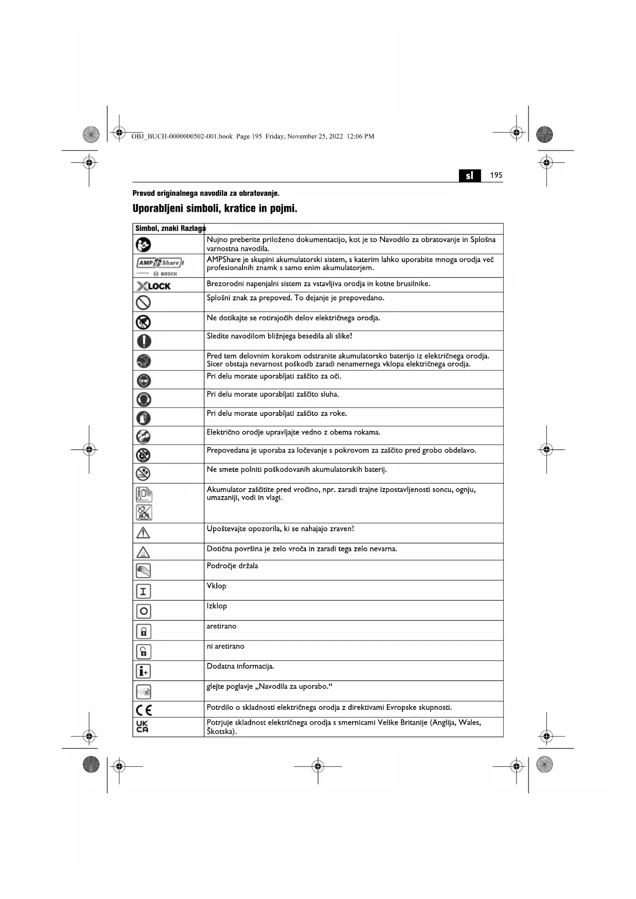 Prevod originalnega navodila za obratovanje. Uporabljeni simboli, kratice in pojmi. Simbol, znaki Razlaga Nujno preberite priloženo dokumentacijo, kot je to Navodilo za obratovanje in Splošna varnostna navodila. AMPShare je skupini akumulatorski sistem, s katerim lahko uporabite mnoga orodja več profesionalnih znamk s samo enim akumulatorjem. Brezorodni napenjalni sistem za vstavljiva orodja in kotne brusilnike. Splošni znak za prepoved. To dejanje je prepovedano. Ne dotikajte se rotirajočih delov električnega orodja. Sledite navodilom bližnjega besedila ali slike! Pred tem delovnim korakom odstranite akumulatorsko baterijo iz električnega orodja. Sicer obstaja nevarnost poškodb zaradi nenamernega vklopa električnega orodja. Pri delu morate uporabljati zaščito za oči. Pri delu morate uporabljati zaščito sluha. Pri delu morate uporabljati zaščito za roke. Električno orodje upravljajte vedno z obema rokama. Prepovedana je uporaba za ločevanje s pokrovom za zaščito pred grobo obdelavo. Ne smete polniti poškodovanih akumulatorskih baterij. Akumulator zaščitite pred vročino, npr. zaradi trajne izpostavljenosti soncu, ognju, umazaniji, vodi in vlagi. Upoštevajte opozorila, ki se nahajajo zraven! Dotična površina je zelo vroča in zaradi tega zelo nevarna. Področje držala Vklop Izklop aretirano ni aretirano Dodatna informacija. glejte poglavje „Navodila za uporabo.“ Potrdilo o skladnosti električnega orodja z direktivami Evropske skupnosti. Potrjuje skladnost električnega orodja s smernicami Velike Britanije (Anglija, Wales, Škotska). max.50°C OBJ_BUCH-0000000502-001.book Page 195 Friday, November 25, 2022 12:06 PM196