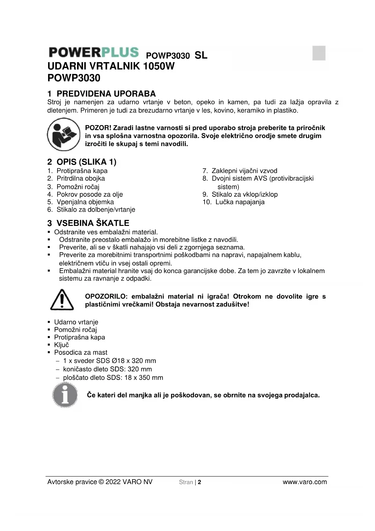 - Električno orodje, opremo in rezalna orodja uporabljajte v skladu s temi navodili in na način, predviden za zadevno vrsto električnega orodja ter pri tem upoštevajte delovne pogoje in obseg dela, ki ga želite opraviti. Uporaba električnega orodja v druge namene je lahko nevarna.POWP3030 SL Avtorske pravice © 2022 VARO NV Stran | 5 www.varo.com