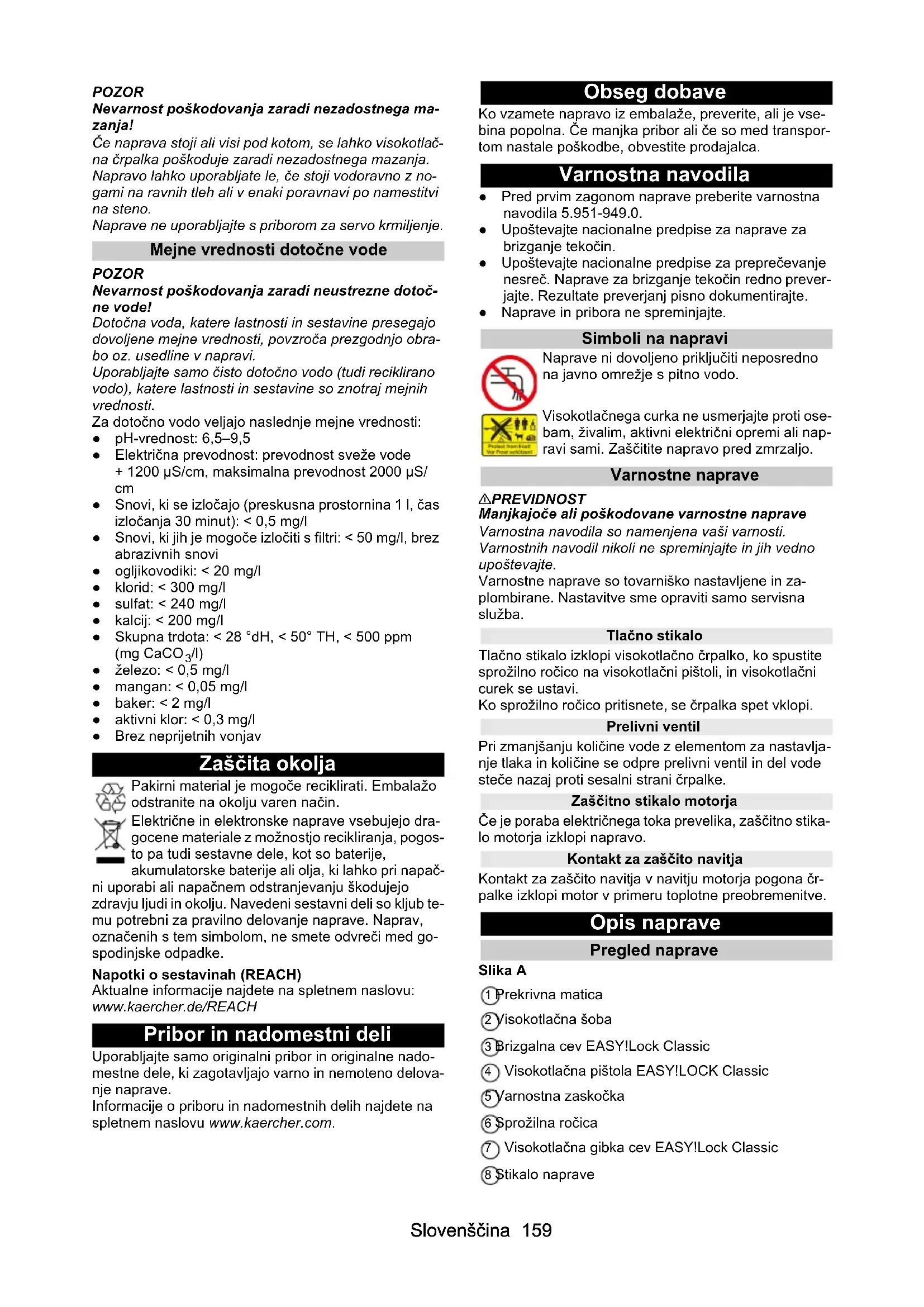 /l) ● železo: < 0,5 mg/l ● mangan: < 0,05 mg/l ● baker: < 2 mg/l ● aktivni klor: < 0,3 mg/l ● Brez neprijetnih vonjav Zaščita okolja Pakirni material je mogoče reciklirati. Embalažo odstranite na okolju varen način. Električne in elektronske naprave vsebujejo dra- gocene materiale z možnostjo recikliranja, pogos- to pa tudi sestavne dele, kot so baterije, akumulatorske baterije ali olja, ki lahko pri napač- ni uporabi ali napačnem odstranjevanju škodujejo zdravju ljudi in okolju. Navedeni sestavni deli so kljub te- mu potrebni za pravilno delovanje naprave. Naprav, označenih s tem simbolom, ne smete odvreči med go- spodinjske odpadke. Napotki o sestavinah (REACH) Aktualne informacije najdete na spletnem naslovu: www.kaercher.de/REACH Pribor in nadomestni deli Uporabljajte samo originalni pribor in originalne nado- mestne dele, ki zagotavljajo varno in nemoteno delova- nje naprave. Informacije o priboru in nadomestnih delih najdete na spletnem naslovu www.kaercher.com. Obseg dobave Ko vzamete napravo iz embalaže, preverite, ali je vse- bina popolna. Če manjka pribor ali če so med transpor- tom nastale poškodbe, obvestite prodajalca. Varnostna navodila ● Pred prvim zagonom naprave preberite varnostna navodila 5.951-949.0. ● Upoštevajte nacionalne predpise za naprave za brizganje tekočin. ● Upoštevajte nacionalne predpise za preprečevanje nesreč. Naprave za brizganje tekočin redno prever- jajte. Rezultate preverjanj pisno dokumentirajte. ● Naprave in pribora ne spreminjajte. Simboli na napravi Naprave ni dovoljeno priključiti neposredno na javno omrežje s pitno vodo. Visokotlačnega curka ne usmerjajte proti ose- bam, živalim, aktivni električni opremi ali nap- ravi sami. Zaščitite napravo pred zmrzaljo. Varnostne naprave 몇 PREVIDNOST Manjkajoče ali poškodovane varnostne naprave Varnostna navodila so namenjena vaši varnosti. Varnostnih navodil nikoli ne spreminjajte in jih vedno upoštevajte. Varnostne naprave so tovarniško nastavljene in za- plombirane. Nastavitve sme opraviti samo servisna služba. Tlačno stikalo Tlačno stikalo izklopi visokotlačno črpalko, ko spustite sprožilno ročico na visokotlačni pištoli, in visokotlačni curek se ustavi. Ko sprožilno ročico pritisnete, se črpalka spet vklopi. Prelivni ventil Pri zmanjšanju količine vode z elementom za nastavlja- nje tlaka in količine se odpre prelivni ventil in del vode steče nazaj proti sesalni strani črpalke. Zaščitno stikalo motorja Če je poraba električnega toka prevelika, zaščitno stika- lo motorja izklopi napravo. Kontakt za zaščito navitja Kontakt za zaščito navitja v navitju motorja pogona čr- palke izklopi motor v primeru toplotne preobremenitve. Opis naprave Pregled naprave Slika A 1 Prekrivna matica 2 Visokotlačna šoba 3 Brizgalna cev EASY!Lock Classic 4 Visokotlačna pištola EASY!LOCK Classic 5 Varnostna zaskočka 6 Sprožilna ročica 7 Visokotlačna gibka cev EASY!Lock Classic 8 Stikalo naprave160 Slovenščina 9 Okvir naprave 10 Element za reguliranje tlaka/količine 11 Visokotlačni priključek EASY!Lock 12 Priključek za vodo 13 Omrežni vtič 14 Omrežni kabel 15 Podstavek (4 kosi) 16 Prikaz ravni olja 17 Izpustni vijak za olje 18 Zanka za obešanje 19 Fini filter 20 Čep 21 Predal za pribor 22 Tipska ploščica (visokotlačna črpalka) 23 Merilna palica za olje z odzračevalnim ventilom 24 Tipska ploščica (naprava) Barvna oznaka ● Upravljalni elementi za postopek čiščenja so rume- ni. ● Upravljalni elementi za vzdrževanje in servis so svetlo sivi. Montaža Pritrditev ali postavitev naprave Naprava je primerna za namestitev na steno ali kot po- končna naprava. Pritrditev na steno NEVARNOST Smrtno nevarno in nevarnost poškodovanja zaradi padca naprave! Če naprava pade, obstaja smrtna nevarnost in nevar- nost poškodovanja. Napravo montirajte le na primerne, nosilne stene. Pri montaži upoštevajte težo naprave. Uporabite ustre- zne dvižne naprave ali si zagotovite pomoč. Uporabite ustrezne pritrdilne elemente in poskrbite za strokovno montažo. Če ste v dvomih, prepustite montažo osebi s strokovnim znanjem. POZOR Nevarnost poškodovanja zaradi zmrzali! Naprava, ki ni popolnoma izpraznjena, se lahko uniči zaradi zmrzali. Napravo zaščitite pred zamrzovanjem. Napravo uporabljajte ali skladiščite na mestu, kjer ni zmrzali. Pred skladiščenjem napravo in pribor popolnoma izpraznite.