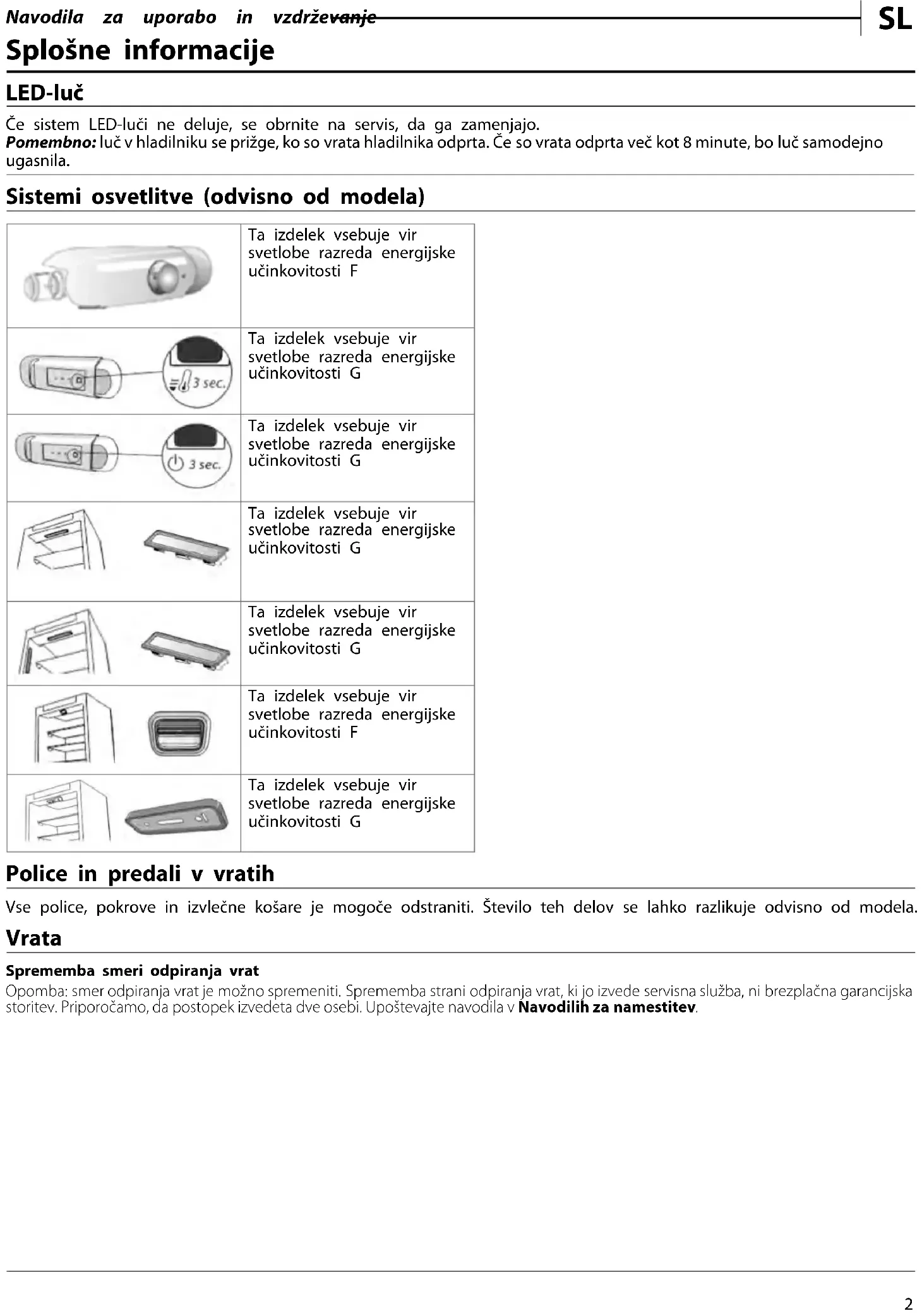 Splošne informacije LED-luč Če sistem LED-luči ne deluje, se obrnite na servis, da ga zamenjajo. Pomembno: luč v hladilniku se prižge, ko so vrata hladilnika odprta. Če so vrata odprta več kot 8 minute, bo luč samodejno ugasnila. Sistemi osvetlitve (odvisno od modela) Ta izdelek vsebuje vir svetlobe razreda energijske učinkovitosti F Ta izdelek vsebuje vir svetlobe razreda energijske učinkovitosti G Ta izdelek vsebuje vir svetlobe razreda energijske učinkovitosti G Ta izdelek vsebuje vir svetlobe razreda energijske učinkovitosti G Ta izdelek vsebuje vir svetlobe razreda energijske učinkovitosti G Ta izdelek vsebuje vir svetlobe razreda energijske učinkovitosti F Ta izdelek vsebuje vir svetlobe razreda energijske učinkovitosti G Police in predali v vratih Vse police, pokrove in izvlečne košare je mogoče odstraniti. Število teh delov se lahko razlikuje odvisno od modela. Vrata Sprememba smeri odpiranja vrat Opomba: smer odpiranja vrat je možno spremeniti. Sprememba strani odpiranja vrat, ki jo izvede servisna služba, ni brezplačna garancijska storitev. Priporočamo, da postopek izvedeta dve osebi. Upoštevajte navodila v Navodilih za namestitev.Navodila za uporabo in vzdrževanje