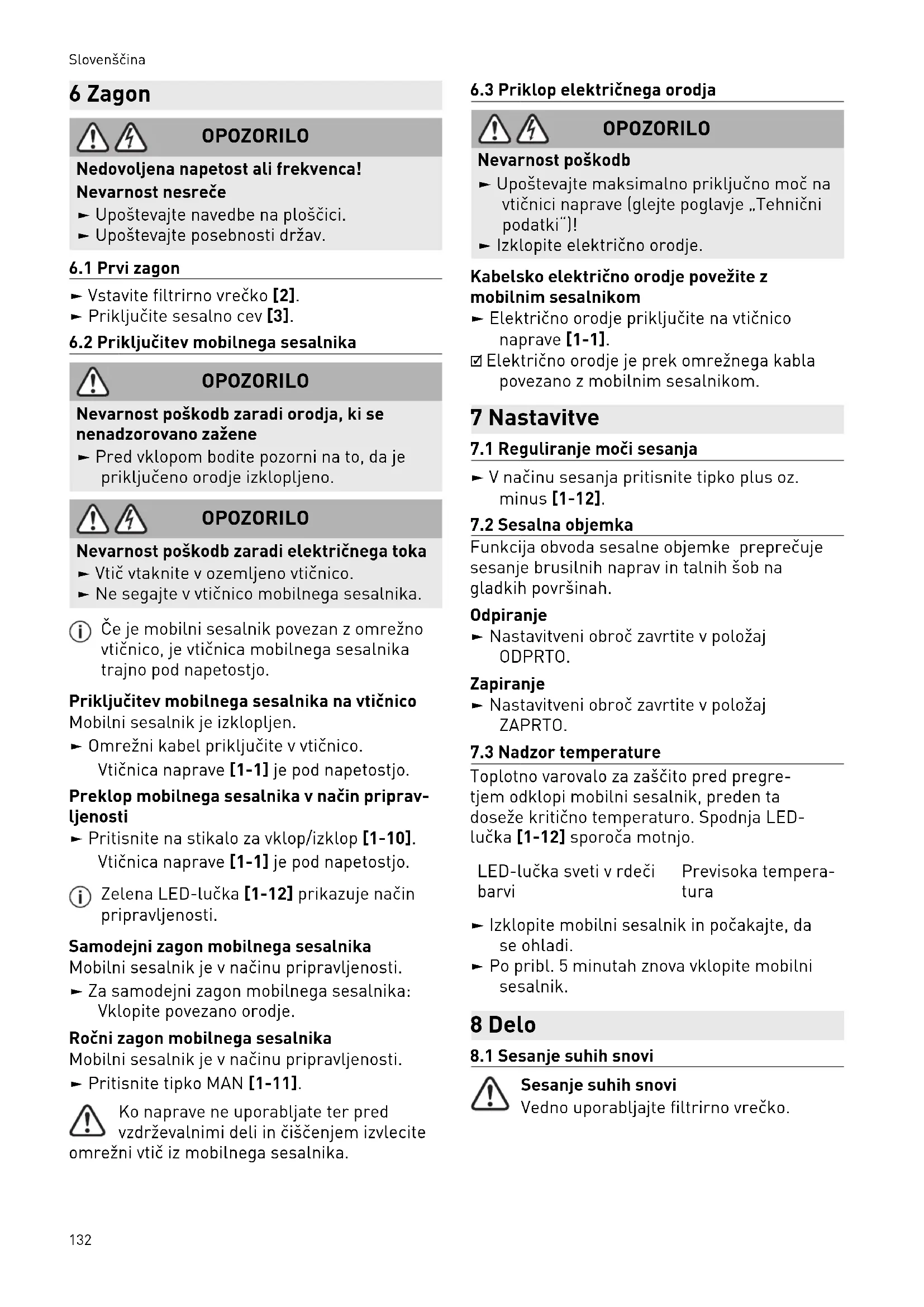 OPOZORILO Nevarnost poškodb zaradi električnega toka ► Vtič vtaknite v ozemljeno vtičnico. ► Ne segajte v vtičnico mobilnega sesalnika. Če je mobilni sesalnik povezan z omrežno vtičnico, je vtičnica mobilnega sesalnika trajno pod napetostjo. Priključitev mobilnega sesalnika na vtičnico Mobilni sesalnik je izklopljen. ► Omrežni kabel priključite v vtičnico. Vtičnica naprave [1-1] je pod napetostjo. Preklop mobilnega sesalnika v način priprav ljenosti ► Pritisnite na stikalo za vklop/izklop [1-10]. Vtičnica naprave [1-1] je pod napetostjo. Zelena LED-lučka[1-12] prikazuje način pripravljenosti. Samodejni zagon mobilnega sesalnika Mobilni sesalnik je v načinu pripravljenosti. ► Za samodejni zagon mobilnega sesalnika: Vklopite povezano orodje. Ročni zagon mobilnega sesalnika Mobilni sesalnik je v načinu pripravljenosti. ► Pritisnite tipko MAN[1-11]. Ko naprave ne uporabljate ter pred vzdrževalnimi deli in čiščenjem izvlecite omrežni vtič iz mobilnega sesalnika.