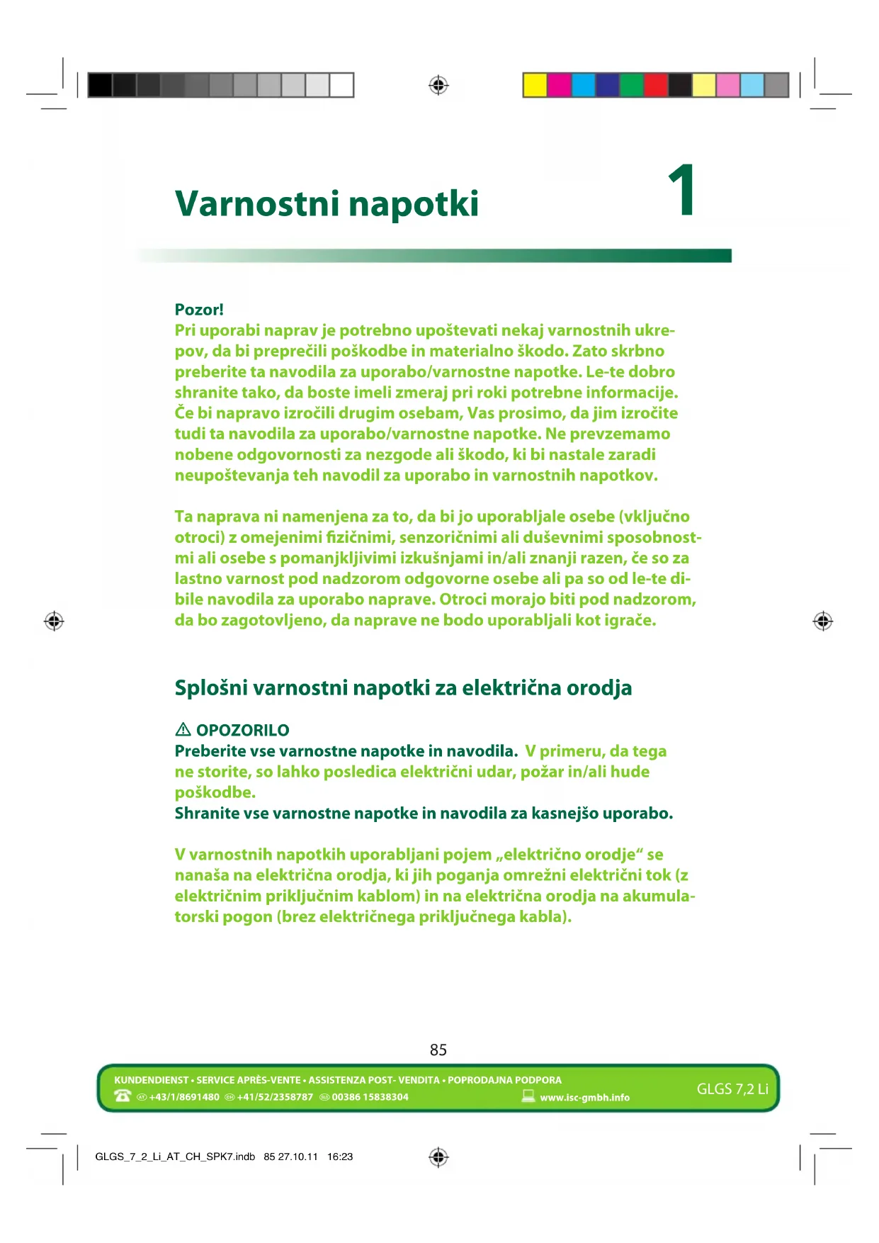 +43/1/8691480 +41/52/2358787 00386 15838304KUNDENDIENST • SERVICE APRÈS-VENTE • ASSISTENZA POST- VENDITA • POPRODAJNA PODPORAwww.isc-gmbh.info GLGS 7,2 Li Pozor! Pri uporabi naprav je potrebno upoštevati nekaj varnostnih ukre- pov, da bi preprečili poškodbe in materialno škodo. Zato skrbno preberite ta navodila za uporabo/varnostne napotke. Le-te dobro shranite tako, da boste imeli zmeraj pri roki potrebne informacije. Če bi napravo izročili drugim osebam, Vas prosimo, da jim izročite tudi ta navodila za uporabo/varnostne napotke. Ne prevzemamo nobene odgovornosti za nezgode ali škodo, ki bi nastale zaradi neupoštevanja teh navodil za uporabo in varnostnih napotkov. Ta naprava ni namenjena za to, da bi jo uporabljale osebe (vključno otroci) z omejenimi zičnimi, senzoričnimi ali duševnimi sposobnost- mi ali osebe s pomanjkljivimi izkušnjami in/ali znanji razen, če so za lastno varnost pod nadzorom odgovorne osebe ali pa so od le-te di- bile navodila za uporabo naprave. Otroci morajo biti pod nadzorom, da bo zagotovljeno, da naprave ne bodo uporabljali kot igrače. Splošni varnostni napotki za električna orodja m OPOZORILO Preberite vse varnostne napotke in navodila. V primeru, da tega ne storite, so lahko posledica električni udar, požar in/ali hude poškodbe. Shranite vse varnostne napotke in navodila za kasnejšo uporabo. V varnostnih napotkih uporabljani pojem „električno orodje“ se nanaša na električna orodja, ki jih poganja omrežni električni tok (z električnim priključnim kablom) in na električna orodja na akumula- torski pogon (brez električnega priključnega kabla).