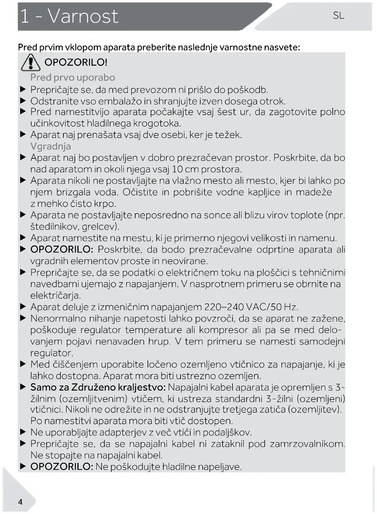 OPOZORILO! Pred prvo uporabo Prepričajte se, da med prevozom ni prišlo do poškodb. Odstranite vso embalažo in shranjujte izven dosega otrok. Pred namestitvijo aparata počakajte vsaj šest ur, da zagotovite polno učinkovitost hladilnega krogotoka. Aparat naj prenašata vsaj dve osebi, ker je težek. Vgradnja Aparat naj bo postavljen v dobro prezračevan prostor. Poskrbite, da bo nad aparatom in okoli njega vsaj 10 cm prostora. Aparata nikoli ne postavljajte na vlažno mesto ali mesto, kjer bi lahko po njem brizgala voda. Očistite in pobrišite vodne kapljice in madeže z mehko čisto krpo. Aparata ne postavljajte neposredno na sonce ali blizu virov toplote (npr. štedilnikov, grelcev). Aparat namestite na mestu, ki je primerno njegovi velikosti in namenu. OPOZORILO: Poskrbite, da bodo prezračevalne odprtine aparata ali vgradnih elementov proste in neovirane. Prepričajte se, da se podatki o električnem toku na ploščici s tehničnimi navedbami ujemajo z napajanjem. V nasprotnem primeru se obrnite na električarja. Aparat deluje z izmeničnim napajanjem 220–240 VAC/50 Hz. Nenormalno nihanje napetosti lahko povzroči, da se aparat ne zažene, poškoduje regulator temperature ali kompresor ali pa se med delo- vanjem pojavi nenavaden hrup. V tem primeru se namesti samodejni regulator. Med čiščenjem uporabite ločeno ozemljeno vtičnico za napajanje, ki je lahko dostopna. Aparat mora biti ustrezno ozemljen. Samo za Združeno kraljestvo: Napajalni kabel aparata je opremljen s 3- žilnim (ozemljitvenim) vtičem, ki ustreza standardni 3-žilni (ozemljeni) vtičnici. Nikoli ne odrežite in ne odstranjujte tretjega zatiča (ozemljitev). Po namestitvi aparata mora biti vtič dostopen. Ne uporabljajte adapterjev z več vtiči in podaljškov. Prepričajte se, da se napajalni kabel ni zataknil pod zamrzovalnikom. Ne stopajte na napajalni kabel. OPOZORILO: Ne poškodujte hladilne napeljave.SL