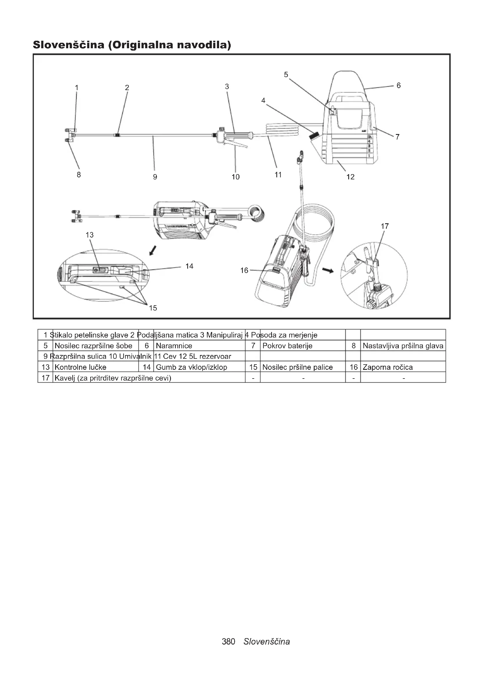 Li-ion Samo za države EU Zaradi prisotnosti nevarnih komponent v opremi imajo lahko uporabljena elek- trična in elektronska oprema, akumula- torji in baterije negativen vpliv na okolje in zdravje ljudi. Električnih in elektronskih naprav ali baterij ne odlagajte med gospodinjske odpadke! Skladno z evropsko Direktivo o odpadni električni in elektronski opremi, o akumu- latorjih in baterijah ter odpadnih akumu- latorjih in baterijah ter njeno uporabo v državnih zakonih morate rabljeno električno in elektronsko opremo, bate- rije in akumulatorje zbirati ločeno ter dostaviti na posebno zbiralno mesto za komunalne odpadke, ki deluje skladno s predpisi za zaščito okolja. To nakazuje simbol prečrtanega smet- njaka s kolesi, ki je natisnjen na opremi. Nosite dihalno masko. Nosite zaščito za oči. Nosite zaščitne čevlje. Nosite zaščitne rokavice. Ne uporabljajte v dežju in razpršilca ne puščajte zunaj v dežju. Preberite navodila za uporabo. Pri škropljenju pazite, da se ljudje ob vas izogibajo.382 Slovenščina NAMEN UPORABE Ta stroj je namenjen pršenju. Hrup Tipična A-utežena raven hrupa, določena v skladu z EN62841-1:Raven zvočnega tlaka (L ): 70 dB (A) ali manjOdstopanje (K): 3 dB (A)OPOMBA: Navedene vrednosti emisij hrupa so bile izmerjene v skladu s standardno preskusno metodo in se lahko uporabijo za primerjavo enega orodja z drugim.OPOMBA: Navedene vrednosti emisij hrupa se lahko uporabijo tudi v predhodni oceni izpostavljenosti.OPOZORILO: Nosite zaščito za sluh.OPOZORILO: Emisija hrupa med dejansko uporabo električnega orodja se lahko razlikuje od navedene vrednosti, odvisno od načina uporabe orodja, zlasti vrste obdelovanca.OPOZORILO: Prepričajte se, da ste opredelili varnostne ukrepe za zaščito upravljavca, ki teme-ljijo na oceni izpostavljenosti v dejanskih pogojih uporabe (ob upoštevanju vseh delov obratoval-nega cikla, na primer, ko je orodje izklopljen in v prostem teku poleg časa potovanja). Vibracije Skupne vrednosti vibracij (vektorska vsota treh osi) v skladu z EN62841-1: Delovni način: delovanje brez obremenitev Emisije vibracij (a ): 2,5 m/s ali manj Odstopanje (K): 1,5 m/s OPOMBA: Navedene skupne vrednosti vibracij so bile izmerjene v skladu s standardno preskusno metodo in se lahko uporabijo za primerjavo enega orodja z drugim.OPOMBA: Navedene skupne vrednosti vibra-cij se lahko uporabijo tudi v predhodni oceni izpostavljenosti.OPOZORILO: Emisije tresljajev med dejansko uporabo električnega orodja se lahko razlikujejo od deklariranih vrednosti, odvisno od načina uporabe orodja, zlasti vrste obdelovanca.OPOZORILO: Prepričajte se, da ste opredelili varnostne ukrepe za zaščito upravljavca, ki teme-ljijo na oceni izpostavljenosti v dejanskih pogojih uporabe (ob upoštevanju vseh delov obratoval-nega cikla, na primer, ko je orodje izklopljen in v prostem teku poleg časa potovanja). EC-Izjava o Skladnosti Samo za evropske državeIzjava o skladnosti EC je vključena v dodatek A teh navodil za uporabo. OPOZORILO Če ste sprejeli nadzor ali navo- dila za varno uporabo te opreme in lahko razumete nevarnosti, jo lahko uporabljajo otroci, stari 8 let in več, pa tudi osebe s šibkimi zičnimi, senzoričnimi ali duševnimi sposobnostmi ali pomanjkanjem izkušenj in zna- nja. Otroci se ne smejo igrati s tem izdelkom. Otroci ne smejo izvajati čiščenja in vzdrževanja brez nadzora. Splošna varnostna opozorila za električna orodja OPOZORILO: Preberite vsa varnostna opozo- rila, navodila, ilustracije in specikacije, priložene temu električnemu orodju. Neupoštevanje vseh spodnjih navodil lahko povzroči električni udar, požar, in/ali resno poškodbo. Opozorila in navodila shranite za uporabo v prihodnje. Izraz “električno orodje“ v opozorilih se nanaša na vaše orodje, priključeno na omrežje (s kablom) ali orodje, ki ga napaja akumulator (brez kabla).Varnost delovnega območja1. Delovno območje mora biti čisto in dobro osvetljeno. Nered ali temna območja spodbujata nastanek nesreč.2. Ne upravljajte z električnim orodjem v eksplozij-skih območjih, na primer v prisotnosti vnetljivih tekočin, plinov ali prahu. Električna orodja lahko povzročijo iskre, zaradi katerih se lahko vnamejo prah ali hlapi.3. Otroci ali opazovalci naj se ne zadržujejo v bli-žini, ko upravljate z električnim orodjem. Zaradi motenj lahko izgubite nadzor.383 Slovenščina Električna varnost