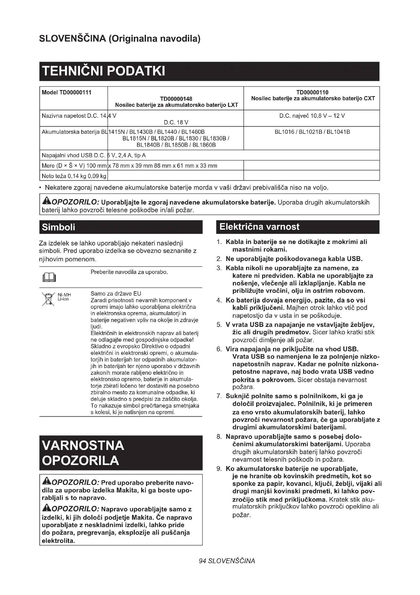 - Nekatere zgoraj navedene akumulatorske baterije morda v vaši državi prebivališča niso na voljo. OPOZORILO: Uporabljajte le zgoraj navedene akumulatorske baterije. Uporaba drugih akumulatorskih baterij lahko povzroči telesne poškodbe in/ali požar. Simboli Za izdelek se lahko uporabljajo nekateri naslednji simboli. Pred uporabo izdelka se obvezno seznanite z njihovim pomenom. Preberite navodila za uporabo. Ni-MH Li-ion Samo za države EU Zaradi prisotnosti nevarnih komponent v opremi imajo lahko uporabljena električna in elektronska oprema, akumulatorji in baterije negativen vpliv na okolje in zdravje ljudi. Električnih in elektronskih naprav ali baterij ne odlagajte med gospodinjske odpadke! Skladno z evropsko Direktivo o odpadni električni in elektronski opremi, o akumula- torjih in baterijah ter odpadnih akumulator- jih in baterijah ter njeno uporabo v državnih zakonih morate rabljeno električno in elektronsko opremo, baterije in akumula- torje zbirati ločeno ter dostaviti na posebno zbiralno mesto za komunalne odpadke, ki deluje skladno s predpisi za zaščito okolja. To nakazuje simbol prečrtanega smetnjaka s kolesi, ki je natisnjen na opremi. VARNOSTNA OPOZORILA OPOZORILO: Pred uporabo preberite navo- dila za uporabo izdelka Makita, ki ga boste upo- rabljali s to napravo. OPOZORILO: Napravo uporabljajte samo z izdelki, ki jih določi podjetje Makita. Če napravo uporabljate z neskladnimi izdelki, lahko pride do požara, pregrevanja, eksplozije ali puščanja elektrolita. Električna varnost
