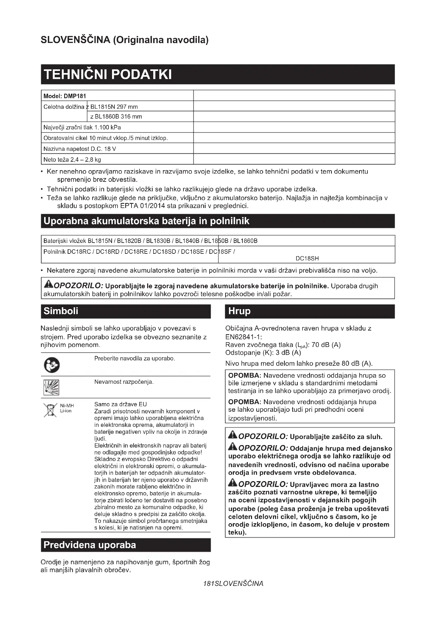 Model: DMP181 Celotna dolžina z BL1815N 297 mm z BL1860B 316 mm Največji zračni tlak 1.100 kPa Obratovalni cikel 10 minut vklop./5 minut izklop. Nazivna napetost D.C. 18 V Neto teža 2,4 – 2,8 kg