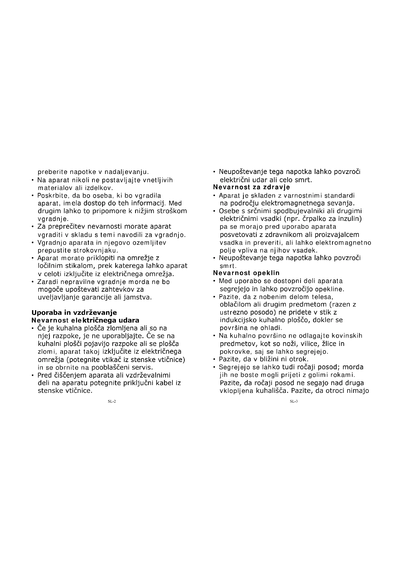 - Pred vgradnjo in uporabo aparata pozorno Varnostna opozorila Vaša varnost je za nas izrednega pomena. Pred uporabo kuhalne plošče preberite informacije v nadaljevanju. Vgradnja Nevarnost električnega udaraSL-2 preberite napotke v nadaljevanju.