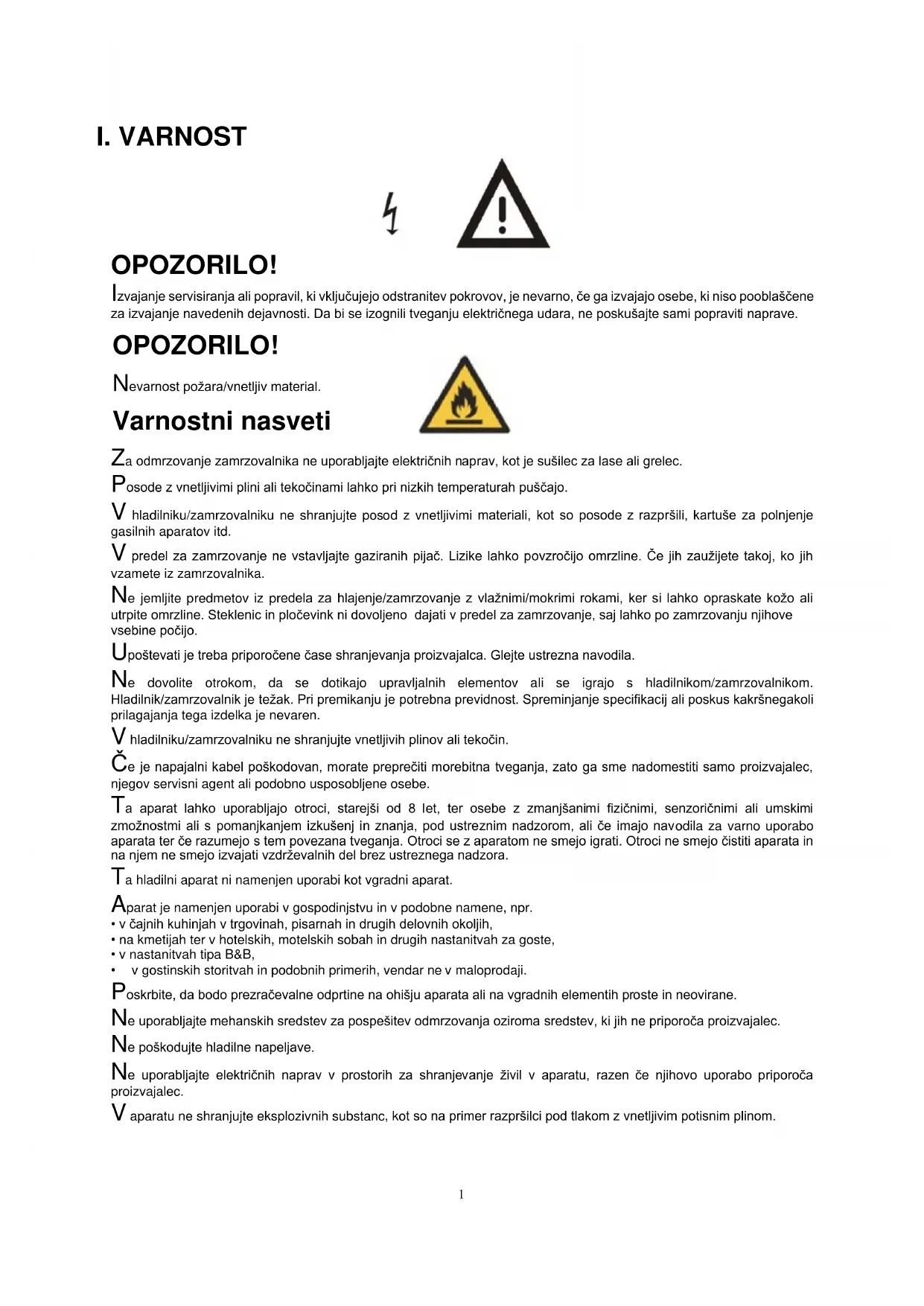 OPOZORILO! Izvajanje servisiranja ali popravil, ki vključujejo odstranitev pokrovov, je nevarno, če ga izvajajo osebe, ki niso pooblaščene za izvajanje navedenih dejavnosti. Da bi se izognili tveganju električnega udara, ne poskušajte sami popraviti naprave. OPOZORILO! Nevarnost požara/vnetljiv material. Varnostni nasveti Za odmrzovanje zamrzovalnika ne uporabljajte električnih naprav, kot je sušilec za lase ali grelec. Posode z vnetljivimi plini ali tekočinami lahko pri nizkih temperaturah puščajo. V hladilniku/zamrzovalniku ne shranjujte posod z vnetljivimi materiali, kot so posode z razpršili, kartuše za polnjenje gasilnih aparatov itd. V predel za zamrzovanje ne vstavljajte gaziranih pijač. Lizike lahko povzročijo omrzline. Če jih zaužijete takoj, ko jih vzamete iz zamrzovalnika. Ne jemljite predmetov iz predela za hlajenje/zamrzovanje z vlažnimi/mokrimi rokami, ker si lahko opraskate kožo ali utrpite omrzline. Steklenic in pločevink ni dovoljeno dajati v predel za zamrzovanje, saj lahko po zamrzovanju njihove vsebine počijo. Upoštevati je treba priporočene čase shranjevanja proizvajalca. Glejte ustrezna navodila. Ne dovolite otrokom, da se dotikajo upravljalnih elementov ali se igrajo s hladilnikom/zamrzovalnikom. Hladilnik/zamrzovalnik je težak. Pri premikanju je potrebna previdnost. Spreminjanje specifikacij ali poskus kakršnegakoli prilagajanja tega izdelka je nevaren. V hladilniku/zamrzovalniku ne shranjujte vnetljivih plinov ali tekočin. Če je napajalni kabel poškodovan, morate preprečiti morebitna tveganja, zato ga sme nadomestiti samo proizvajalec, njegov servisni agent ali podobno usposobljene osebe. Ta aparat lahko uporabljajo otroci, starejši od 8 let, ter osebe z zmanjšanimi fizičnimi, senzoričnimi ali umskimi zmožnostmi ali s pomanjkanjem izkušenj in znanja, pod ustreznim nadzorom, ali če imajo navodila za varno uporabo aparata ter če razumejo s tem povezana tveganja. Otroci se z aparatom ne smejo igrati. Otroci ne smejo čistiti aparata in na njem ne smejo izvajati vzdrževalnih del brez ustreznega nadzora. Ta hladilni aparat ni namenjen uporabi kot vgradni aparat. Aparat je namenjen uporabi v gospodinjstvu in v podobne namene, npr.