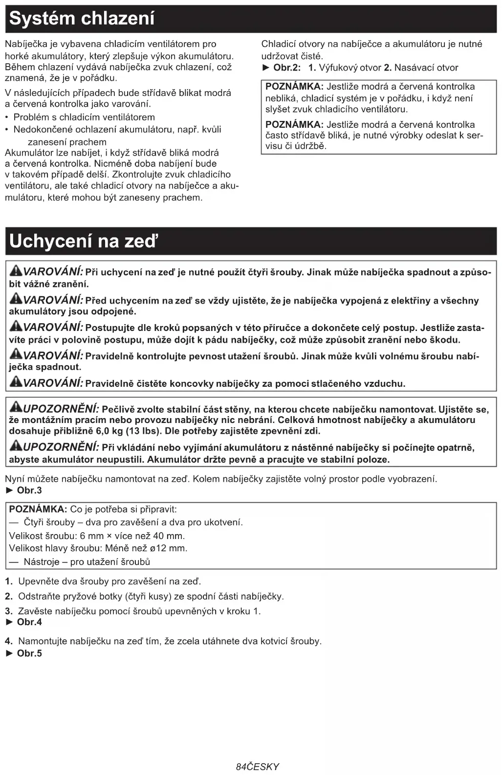- Nezadostna ohladitev akumulatorja, ki jo lahko povzroči na primer zamašenost s prahom Akumulator je mogoče polniti, čeprav izmenično svetita modra in rdeča lučka. Zaradi tega pa se bo podaljšal čas polnjenja. Preverite, ali slišite zvok ventilatorja in zračnika v polnilniku in akumulatorju, ki se lahko včasih zamašita zaradi prahu. Zračnik za hlajenje na polnilniku in akumulatorju mora biti vedno čist. ► Sl.2: 1. Izpustna reža 2. Sesalna reža OPOMBA: Če modra in rdeča lučka ne svetita, sis- tem za hlajenje deluje pravilno, tudi če ni mogoče slišati zvoka ventilatorja. OPOMBA: Če modra in rdeča lučka pogosto izme- nično svetita, je treba izdelke poslati na popravilo ali vzdrževanje. Namestitev na steno OPOZORILO: Polnilnik namestite na steno s štirimi vijaki. Če ga ne namestite trdno, lahko polnilnik pade in povzroči resne poškodbe. OPOZORILO: Preden polnilnik namestite na steno, se prepričajte, da je odklopljen iz električnega omrežja in so iz njega odstranjeni vsi akumulatorji. OPOZORILO: Sledite korakom v tem priročniku in izvedite vse naenkrat (korak za korakom). Polnilnik lahko pade in povzroči poškodbe ali okvare, če postopka namestitve ne izvedete do konca. OPOZORILO: Redno preverjajte, ali so vijaki ustrezno priviti. Zaradi neustrezno privitih vijakov lahko polnilnik namreč pade. OPOZORILO: Redno čistite priključke polnilnika z razpihovalnikom prahu ipd. POZOR: Pazite, da boste izbrali dovolj stabilno steno za namestitev polnilnika. Nič ne sme ovirati nameščanja ali polnjenja. Bruto teža polnilnika in akumulatorja je približno 6,0 kg (13 lbs). Po potrebi steno ustrezno podprite. POZOR: Pri vstavljanju ali odstranjevanju baterije iz stenskega polnilnika pazite, da vam akumulator- ska baterija ne pade na tla. Čvrsto držite akumulatorsko baterijo in stojte stabilno. Polnilnik lahko namestite na steno. Pustite nekaj prostora okoli polnilnika, kot je prikazano na sliki. ► Sl.3 OPOMBA: Potrebovali boste naslednje: — Štiri vijake – dva za obešanje in dva za sidranje Velikost vijaka: 6 mm x več kot 40 mm. Velikost glave vijaka: Manj kot ø12 mm. — Orodje – za privijanje vijakov