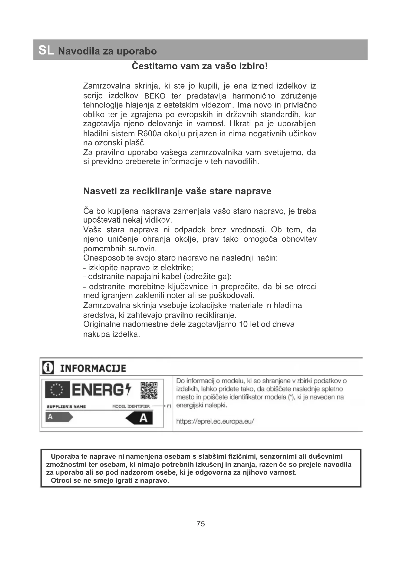 Uporaba te naprave ni namenjena osebam s slabšimi fizičnimi, senzornimi ali duševnimi zmožnostmi ter osebam, ki nimajo potrebnih izkušenj in znanja, razen če so prejele navodila za uporabo ali so pod nadzorom osebe, ki je odgovorna za njihovo varnost.Otroci se ne smejo igrati z napravo. SL Navodila za uporaboRecikliranje embalaže OPOZORILO! Otroci se ne smejo igrati z embalažo ali njenimi deli. Obstaja nevarnost zadušitve z valovito lepenko ali s plastičnim trakom. Da je naprava dostavljena nepoškodovana, jo zavarujemo s primerno embalažo. Vsi materiali embalaže so združljivi z okoljem in primerni za recikliranje. Varujte okolje in nam pomagajte reciklirati embalažo. POMEMBNO! Pred uporabo naprave, previdno in v celoti preberite ta navodila. Vsebujejo pomembne informacije glede priprave, uporabe in vzdrževanja naprave. Proizvajalec ni odgovoren, če teh navodil ne upoštevate. Hranite navodila na varnem in vidnem mestu, kjer ji h lahko čim prej uporabite. Pozneje so lahko uporabna še za drugega uporabnika. POZOR! Napravo lahko uporabljate samo za določene namene (gospodinjska raba) in na primernih območjih, brez dežja, vlage ali drugih vremenskih vplivov. Navodila za prevoz Če se le da, je napravo treba prevažati v navpičnem položaju. Med prevozom mora biti embalaža v brezhibnem stanju. Če je bila naprava med prevozom dana v vodoravni položaj (kot kažejo oznake na embalaži), je priporočljivo, da pred uporabo, počiva 4 ur, da se ponovno nastavi tok hlajenja. Neupoštevanje teh navodil lahko pripelje do okvare motornega kompresorja in preklica njegove garancije. Opozorila in splošni nasveti z Če ste zasledili napako, naprave ne priklapljajte. z Popravila lahko izvede samo usposobljeno osebje. z Izklopite napravo iz napetosti, ko: - popolnoma odtajate napravo; - čistite napravo. Ko izklapljate napravo, povlecite za vtič in ne za kabel. z Zagotovite, da bo med napravo in steno, pred katero stoji, čim manj prostora. z Ne obešajte se na vrata naprave.z Otrokom ne dovolite, da se igrajo z napravo. z Za odtajanje notranjosti zamrzovalnika nikoli ne uporabljate električnih naprav. z Naprave ne uporabljajte v bližini naprav za ogrevanje, kuhalnikov ali drugih virov toplote in ognja. z Zamrzovalnika ne puščajte odprtega dlje kot je treba, ko vanj dajete hrano in jo jemljete ven. z Ne puščajte v napravi hrane, če naprava ne deluje. z V zamrzovalniku ne shranjujte izdelkov, ki vsebujejo vnetljive ali eksplozivne pline. z V zamrzovalniku ne shranjujte pijač z mehurčki (sokovi, mineralna voda, šampanjec itd.) , saj lahko plastenka eksplodira. Ne zamrzujte pijač v plastenkah. z Kock ledu ali sladoleda ne jejte takoj po tem , ko jih vzamete iz zamrzovalnika, saj lahko povzročijo ozebline. z Z mokrimi rokami se nikoli ne dotikajte kovinskih delov ali zamrznjene hrane, saj lahko vaše roke hitro zamrznejo na zelo mrzli površini. z Med skladiščenjem in prevozom naprave poskrbite za n jeno varnost in uporabite distančnike med vrati in predalnikom (na sprednji in zadnji strani). Pred uporabo distančnike odstranite.