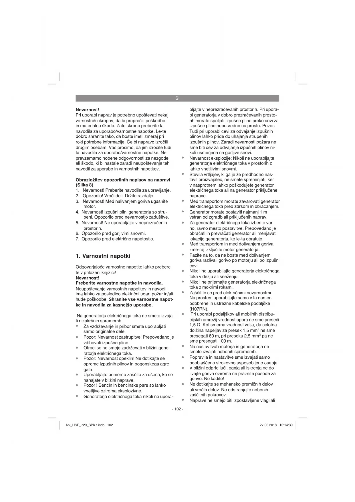 Odgovarjajoče varnostne napotke lahko prebere- te v priloženi knjižici! Nevarnost! Preberite varnostne napotke in navodila. Neupoštevanje varnostnih napotkov in navodil ima lahko za posledico električni udar, požar in/ali hude poškodbe. Shranite vse varnostne napot- ke in navodila za kasnejšo uporabo. Na generatorju električnega toka ne smete izvaja- ti nikakršnih sprememb.