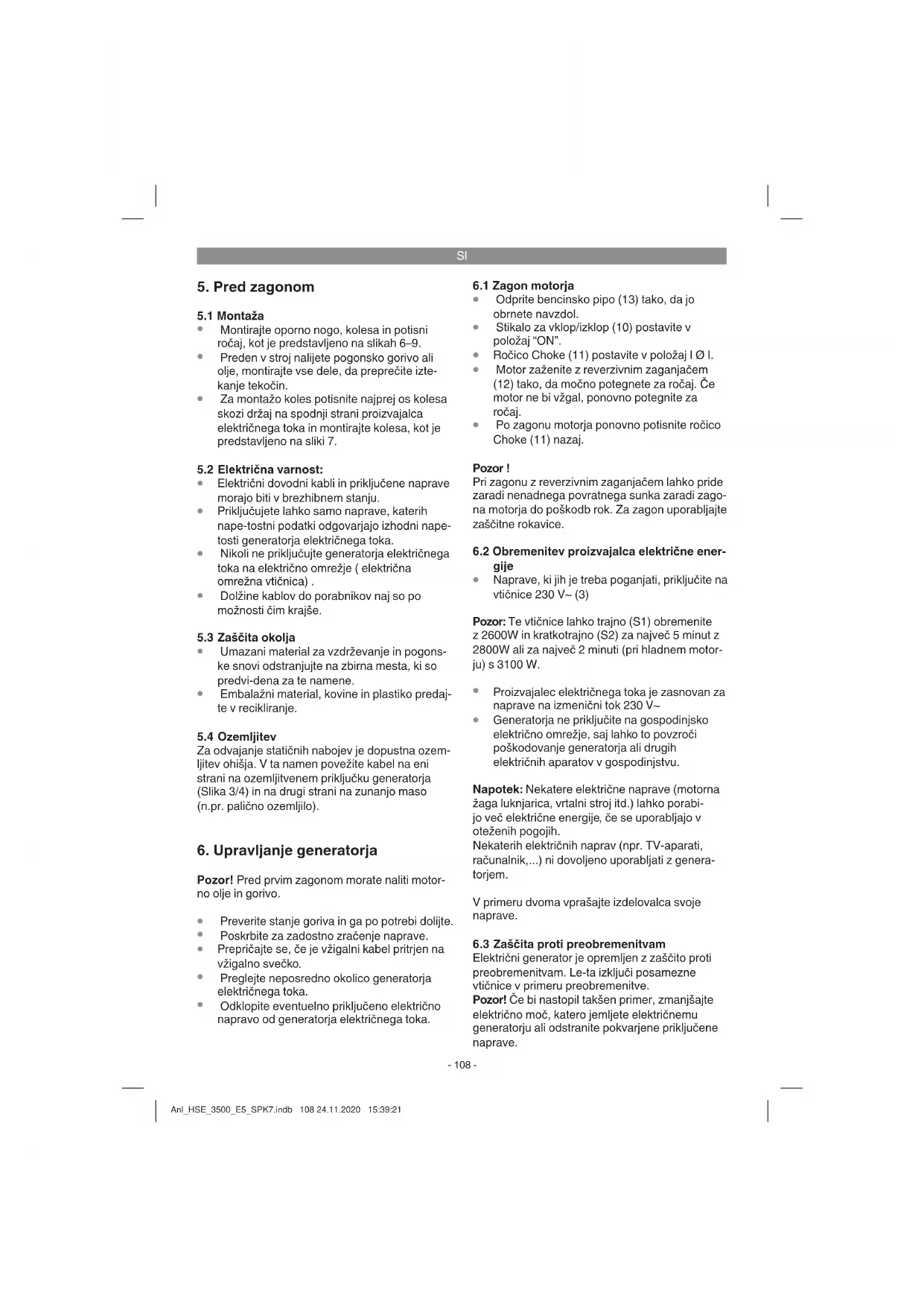 Električni generator je opremljen z zaščito proti preobremenitvam. Le-ta izključi posamezne vtičnice v primeru preobremenitve. Pozor! Če bi nastopil takšen primer, zmanjšajte električno moč, katero jemljete električnemu generatorju ali odstranite pokvarjene priključene naprave. Anl_HSE_3500_E5_SPK7.indb 108 24.11.2020 15:39:21SI