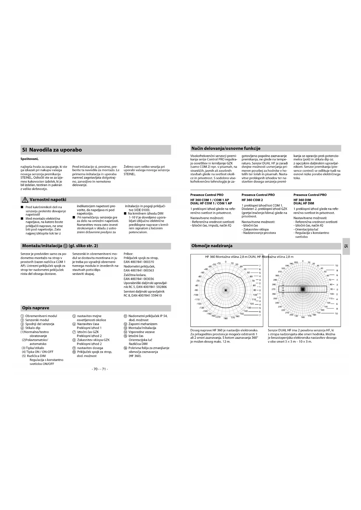 COM 2/DIM) Konica vklopnega toka maks. 800 A/200 μs 30 × (1 × 18 W), 25 × (2 × 18 W) 25 × (1 × 36 W), 15 × (2 × 36 W) 20 × (1 × 58 W), 10 × (2 × 58 W) upoštevajte individualne vklopne toke EPN! Pri večji stikalni zmogljivosti je treba pred tem namestiti rele ali zaščito Moč, preklopni izhod 2 (samo COM 2) (samo HF 360) Prisotnost maks. 230 W/230 V maks. 1A, (cos φ = 1) za GZK (gretje/zračenje/klimo) Mesto uporabe Znotraj stavb Montažna višina (montaža na strop) višina stropa 2,5 m – 3,5 m Kot zaznavanja HF 360 360° s 140° Izstopni kot po potre- bi skozi steklo, les in lahke grad- bene stene. Za prilagoditev pro- stora je mogoče odstarniti 1 ali 2 smeri zaznavanja DUAL HF glej diagram str. 71 po potrebi skozi steklo, les, lahke gradbene stene. Doseg HF 360 maks. Ø 12 m, stopenjsko elektronsko nastavljivo DUAL HF maks. 10 × 3 m v vse smeri stopenjsko elektronsko nastavljivo Preklopni izhod 1 nastavitev časa 30 sek. – 30 min., impulzni način (pribl. 2 sek.), Način IQ (avtomatska prilagoditev na uporabniški profil) Preklopni izhod 2 nastavitev časa (samo HF 360) samo COM2 za GZK 0 sek. – 10 min. zakasnitev vklopa 1 min. – 2 uri. iztočni čas Avtomatsko nadzorovanje prostora DIM: Nastavitev časa 30 sek. – 30 min. Način IQ (avtomatska prilagoditev na uporabniški profil) Krmilni izhod 1 – 10 V / maks. 50 EPN, maks. 100 mA Senzorika Visoka frekvenca 5,8 GHz, oddajna moč < 1 mW Delovanje prek stikala DIP DIP 1 Normalno/testno obratovanje DIP 2 Polavtomatsko/avtomatsko DIP 3 Obratovanje prek tipke/stikala DIP 4 Tipka ON/Tipka ON-OFF DIP 5 Regulacija s konstantno svetlobo ON-OFF (DIM) Vzporedne vezave Master/Slave Master/Master Udobna nastavitev Teach In (z opcijskim daljinskim upravljalnikom) Nastavitev vrednosti svetlobe 10 – 1000 luks, ∞/dnevna svetloba DIM 100 – 1000 luks Vrsta zaščite IP 20 (IP 54 z AP Box) Razred zaščite II Temperaturno območje -25 do +55 °C ohišje odpornost na UV, možnost lakiranja- 74 - - 75 - DIP 4 Na poziciji ON-OFF lahko osvet- litev kadarkoli ročno vklopite in izklopite (izjema impulzni način: ni ročnega IZKLOPA). Na poziciji ON ročni izklop ni več mogoč. Ob vsakem pritisku tipke iztočni čas ponovno začne teči. Tipka ON/ON-OFF DIP 1 Funkcije – nastavitve prek stikala DIP Testno delovanje ima prednost pred vsemi drugimi nastavitvami senzorja premikanja in je name- njeno preverjanju delovanja ter območja zaznavanja. Senzor pre- mikanja ne glede na svetlost vklopi pri premikanju v prostoru osvetlitev za iztočni čas pribl 8 sek. (modra luč LED utripa pri za- znavi). Pri normalnem delovanju veljajo vse individualno nasta- vljene vrednosti Poti. Tudi brez priključene obremenitve je mo- žno nastaviti senzor premikanja s pomočjo modre luči LED. Normalno/testno delovanje (NORM/TEST) DIP 2 Osvetlitev se avtomatsko vklopi in izklopi glede na svetlost in pri- sotnost. Osvetlitev lahko vedno preklapljate tudi ročno. Pri tem se preklopni avtomatizem zača- sno prekine. Ne glede na nasta- vljene vrednosti ostane luč pri ročnem vklopu za 4 ure VKLO- Pljena (2 × pritisnite) ali IZKLOP (1 × pritisnite). Pri pritisku tipk pred pretekom 4 ur se senzor premikanja IR Quattro preklopi na normalno senzorsko delo- vanje. Polavtomatsko (MAN)/avtomatsko (AUTO) Avtomatsko: (AUTO) Polavtomatsko: (MAN) Osvetlitev se izklopi samo še av- tomatsko. Vklop poteka ročno, luč je treba vklopiti prek tipke in ostane prižgana za iztočni čas, ki je nastavljen na Poti. (2 × priti- snite/ 4 ure VKLOP). DIP 3 Senzorju posreduje informacijo o tem, kako naj se vhodni signal obdela. Z dodelitvijo Tipk/stikal je možno senzor upravljati polav