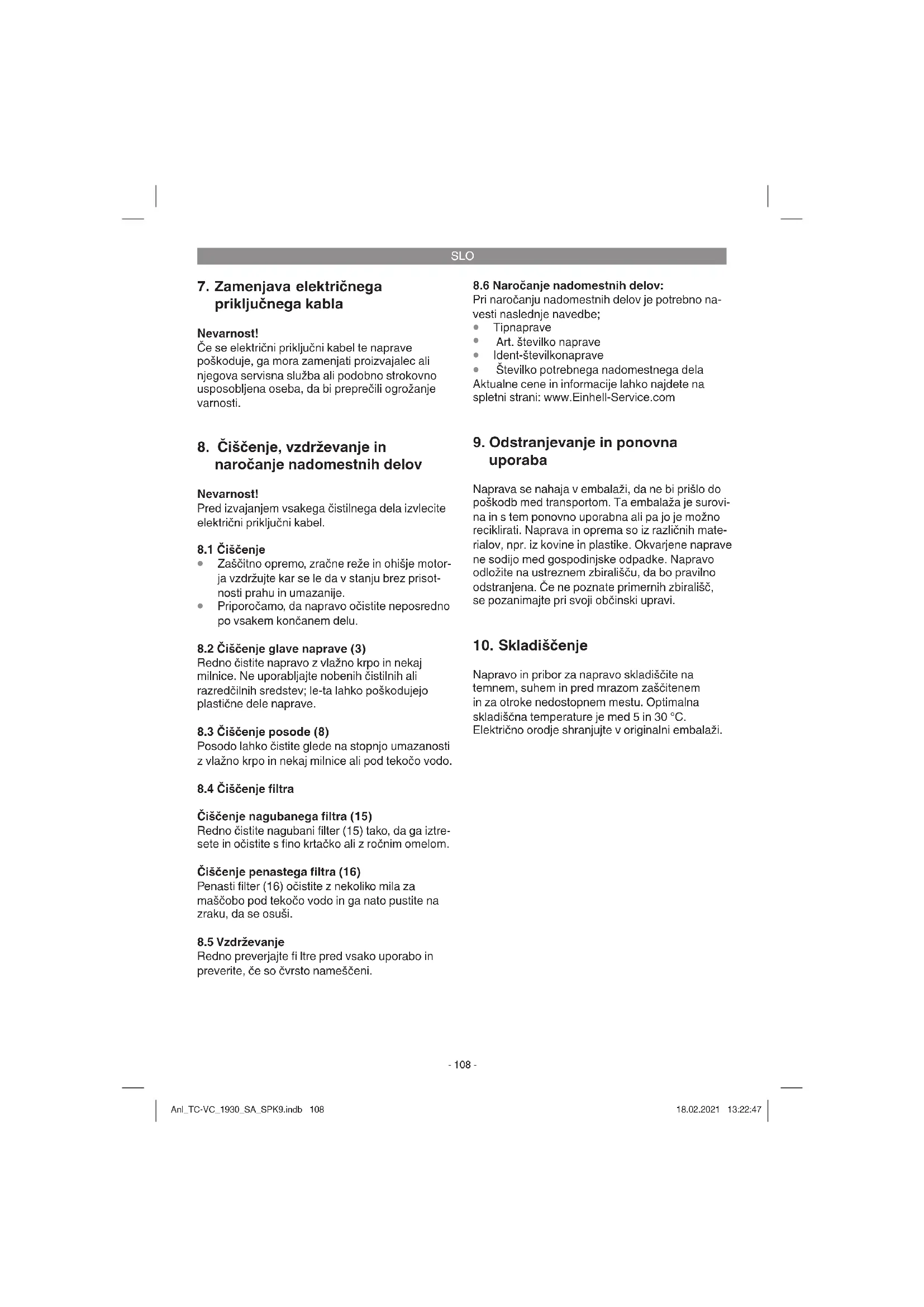 Samo za dežele EU Električnega orodja ne mečite med gospodinjske odpadke! V skladu z evropsko smernico 2012/19/EG o starih električnih in elektronskih napravah in v skladu z iz- vajanjem nacionalne zakonodaje morate ločeno zbirati izrabljena električna orodja in jih predati v okoljs- ko varno ponovno predelavo. Reciklažna alternativa za poziv za vračanje: Lastnik električne naprave je alternativno zavezan, da namesto vračanja sodeluje pri pri strokovno ustreznem recikliranju v primeru predaje lastnine. Staro napravo se lahko v ta namen tudi prepusti na odvzemnem mestu, ki izvaja odstranjevanje v smislu nacionalne zakonodaje o odstranjevanju takšnih odpadkov. To se ne nanaša na starim napravam priložene dele pribora in opreme brez električnih kom- ponent. Ponatis ali kakršnokoli razmnoževanje dokumentacije in spremljajočih papirjev o proizvodu, tudi po izvlečkih, je dovoljeno samo z izrecnim soglasjem Einhell Germany AG. Pridržana pravica do tehničnih sprememb Anl_TC-VC_1930_SA_SPK9.indb 109Anl_TC-VC_1930_SA_SPK9.indb 109 18.02.2021 13:22:4718.02.2021 13:22:47SLO