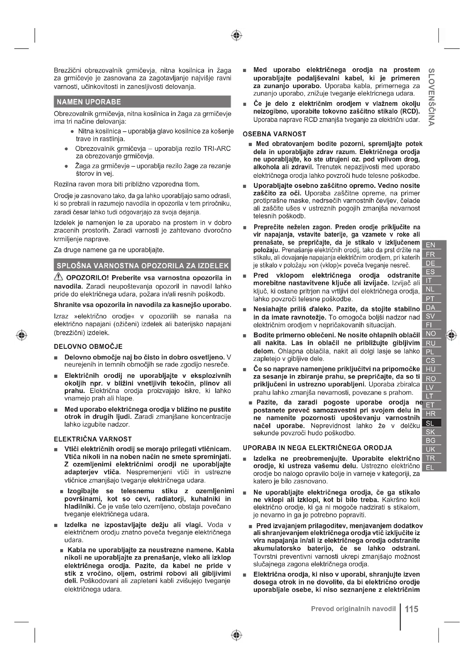 GRMIČEVJA, NITNO KOSILNICO IN ŽAGO ZA GRMIČEVJE ■ Stroja ne uporabljajte v slabem vremenu, predvsem če obstaja nevarnost grmenja. To zmanjša nevarnost udara strele. ■ Temeljito preverite, ali so na območju, kjer nameravate uporabljati stroj, živali. Delujoč stroj lahko poškoduje živali. ■ Temeljito preglejte območje, v katerem boste uporabljali stroj, in odstranite vse kamne, veje, žice, kosti in drug material. Leteči predmeti lahko povzročijo telesne poškodbe. ■ Pred uporabo stroja vedno vizualno preverite, ali sta rezalnik ali rezilo oziroma sestav rezalnika ali rezila poškodovana. Poškodovani deli povečajo nevarnost telesnih poškodb. ■ Upoštevajte navodila za menjavo dodatkov. Neustrezno privite pritrdilne matice ali vijaki rezila lahko poškodujejo rezilo ali povzročijo, da le-to odpade. ■ Nazivna hitrost vrtenja rezila mora biti vsaj enaka največji hitrosti vrtenja, navedeni na stroju. Rezila, ki tečejo s hitrostjo, ki presega njihovo nazivno hitrost vrtenja, se lahko zlomijo in razletijo. ■ Nosite zaščito oči, ušes, glave in rok. Ustrezna zaščitna oprema zmanjša telesne poškodbe zaradi letečega drobirja ali slučajnega stika z rezilno nitko ali rezilom. ■ Med uporabo stroja vedno nosite varnostne čevlje. Naprave ne uporabljajte, če ste bosi ali nosite odprte sandale. S tem se zmanjša možnost poškodb nog, če pridejo v stik s premikajočim se rezalnikom, nitko ali rezilom. ■ Med uporabo stroja vedno nosite dolge hlače. Izpostavljena koža poveča možnost telesnih poškodb zaradi letečih predmetov. ■ Med uporabo stroja naj se opazovalci ne približujejo delovnemu območju. Leteči drobir lahko povzroči hude telesne poškodbe. ■ Stroj vedno uporabljajte z obema rokama. Držanje stroja z obema rokama prepreči izgubo nadzora. ■ Stroj držite izključno za izolirana držala, ker se rezilna nitka ali rezilo lahko dotakne skritih kablov. Rezilna nitka ali rezila, ki pridejo v stik s kablom pod napetostjo, lahko povzročijo prenos napetosti na kovinske dele stroja, zaradi česar operater lahko doživi električni udar. ■ Vedno stabilno stojte in stroj uporabljajte le, ko stojite na tleh. Spolzke ali nestabilne površine lahko povzročijo izgubo ravnotežja ali nadzora nad strojem. ■ Stroja ne uporabljajte na preveč strmih pobočjih. S tem se zmanjša nevarnost izgube nadzora, zdrsa in padca ter posledičnih telesnih poškodb. ■ Med delom na pobočjih hodite s trdnimi koraki in vedno delajte prečno na pobočja, nikoli v smeri navzgor ali navzdol, med spreminjanjem smeri pa bodite izjemno previdni. S tem se zmanjša nevarnost izgube nadzora, zdrsa in padca ter posledičnih telesnih poškodb. ■ Med delovanjem stroja nobenega dela telesa ne približujte rezalniku, nitki ali rezilu. Pred zagonom stroja se prepričajte, da rezalnik, nitka ali rezilo niso v stiku z nobenim predmetom. Trenutek nepozornost med uporabo stroja lahko povzroči telesno poškodbo vas ali drugih.SLOVENŠČINA
