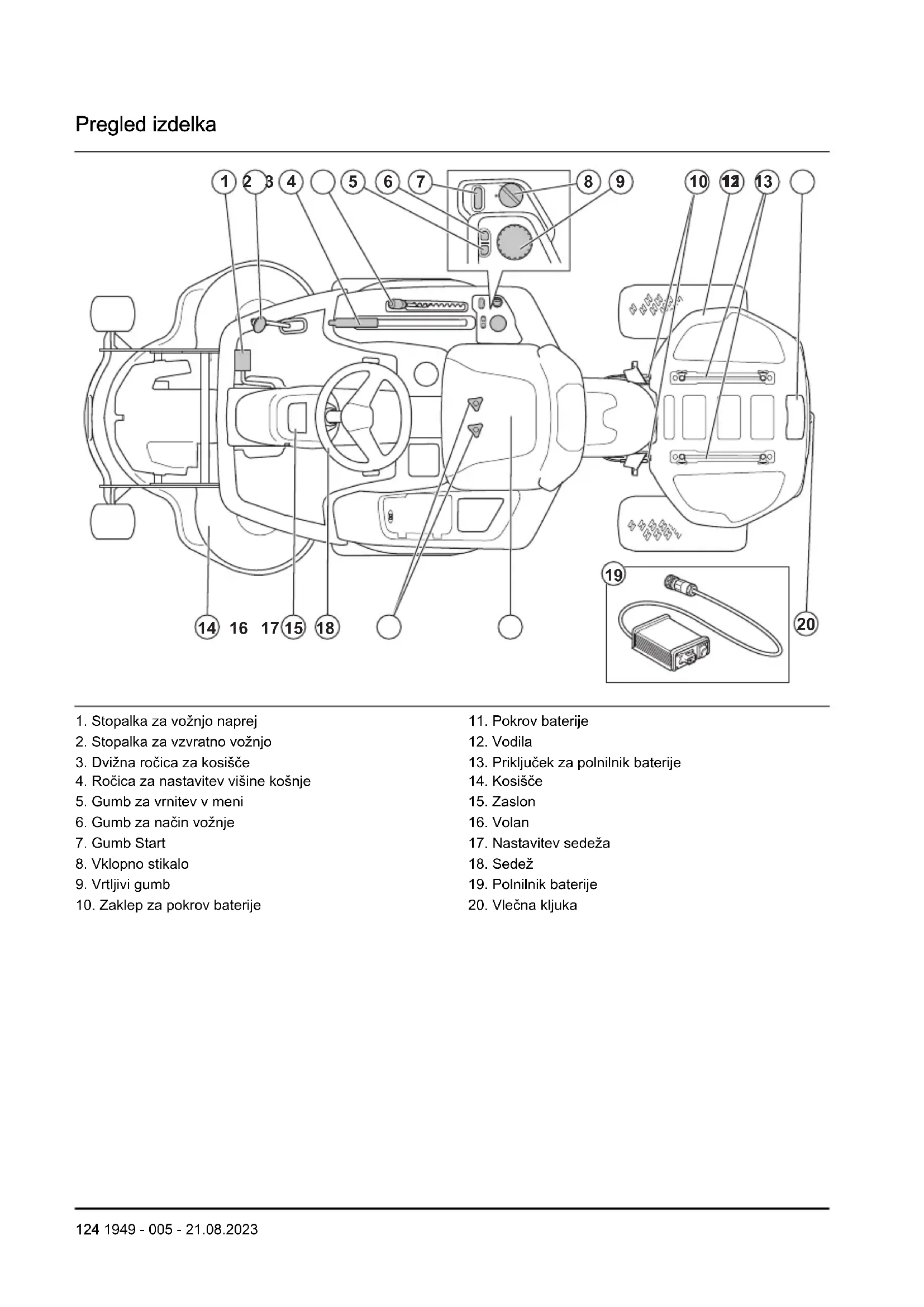 Na izdelku ali opremi ni dovoljeno prevažati potnikov. Samodejna parkirna zavora. Zapeljite naprej. Nevtralna prestava. Zapeljite vzvratno. Stikalo sedeža. Zaženite način vožnje. 1949 - 005 - 21.08.2023 127Izdelek je skladen z veljavnimi direktivami EU. Izdelek je v skladu z veljavnimi direktivami ZK. Emisija hrupa v okolje je skladna z direktivami in uredbami EU, ZK ter zakonodajo Novega južnega Walesa, in sicer z direktivo "Zaščita okolja pri delu (nadzor hrupa) iz 2017". Zajamčena raven zvočne moči izdelka je navedena na in